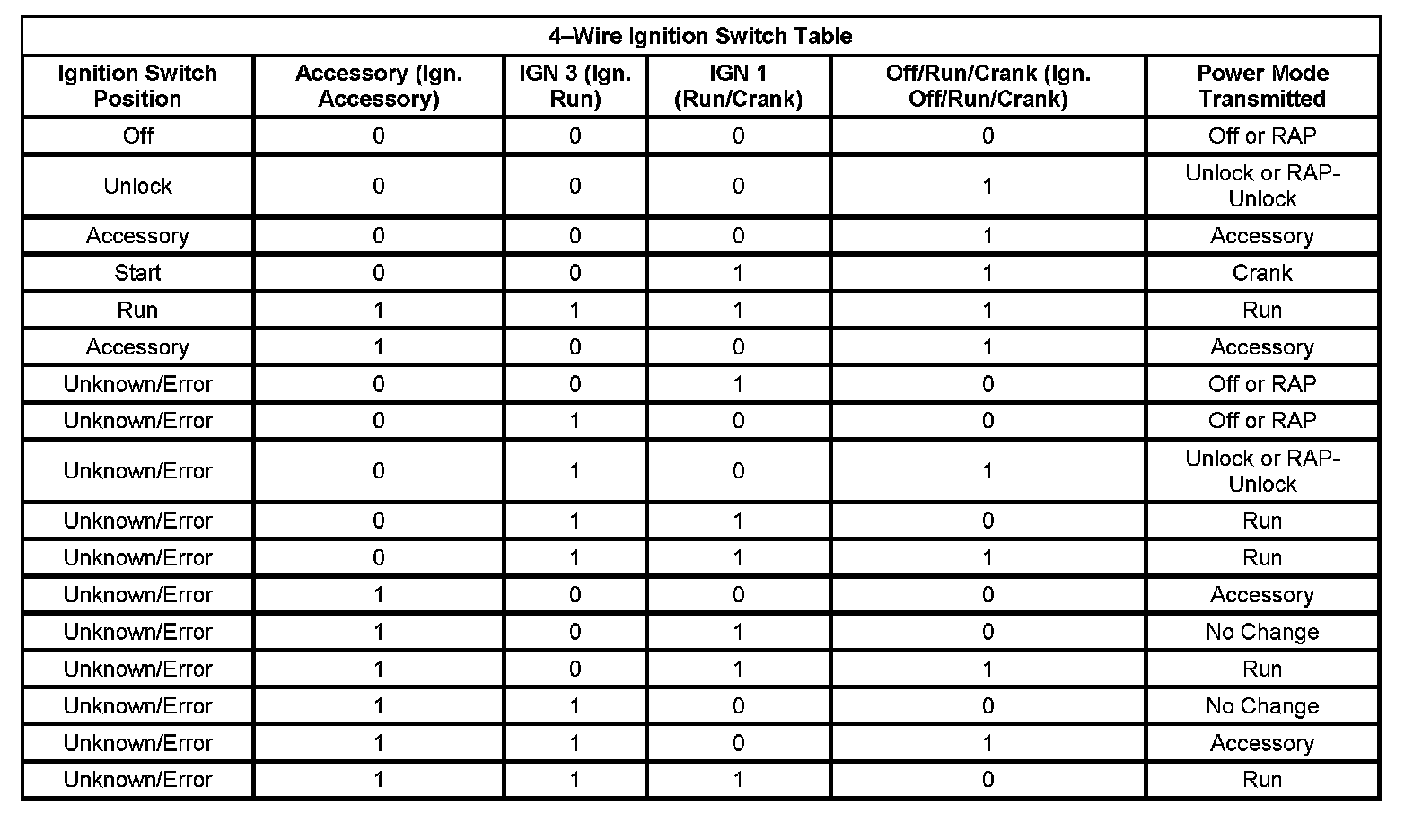 Those modules that have discrete ignition signal inputs also remain in the state dictated by the last valid PMM message received on the serial data circuits. They then check the state of their discrete ignition input to determine the current valid state. If the discrete ignition input is active, battery positive voltage, the modules will fail-safe to the RUN power mode. If the discrete ignition input is not active, open or 0 voltage, the modules will fail-safe to OFF-AWAKE. In this state the modules are constantly checking for a change status message on the serial data circuits and can respond to both local inputs and serial data inputs from other modules on the vehicle.