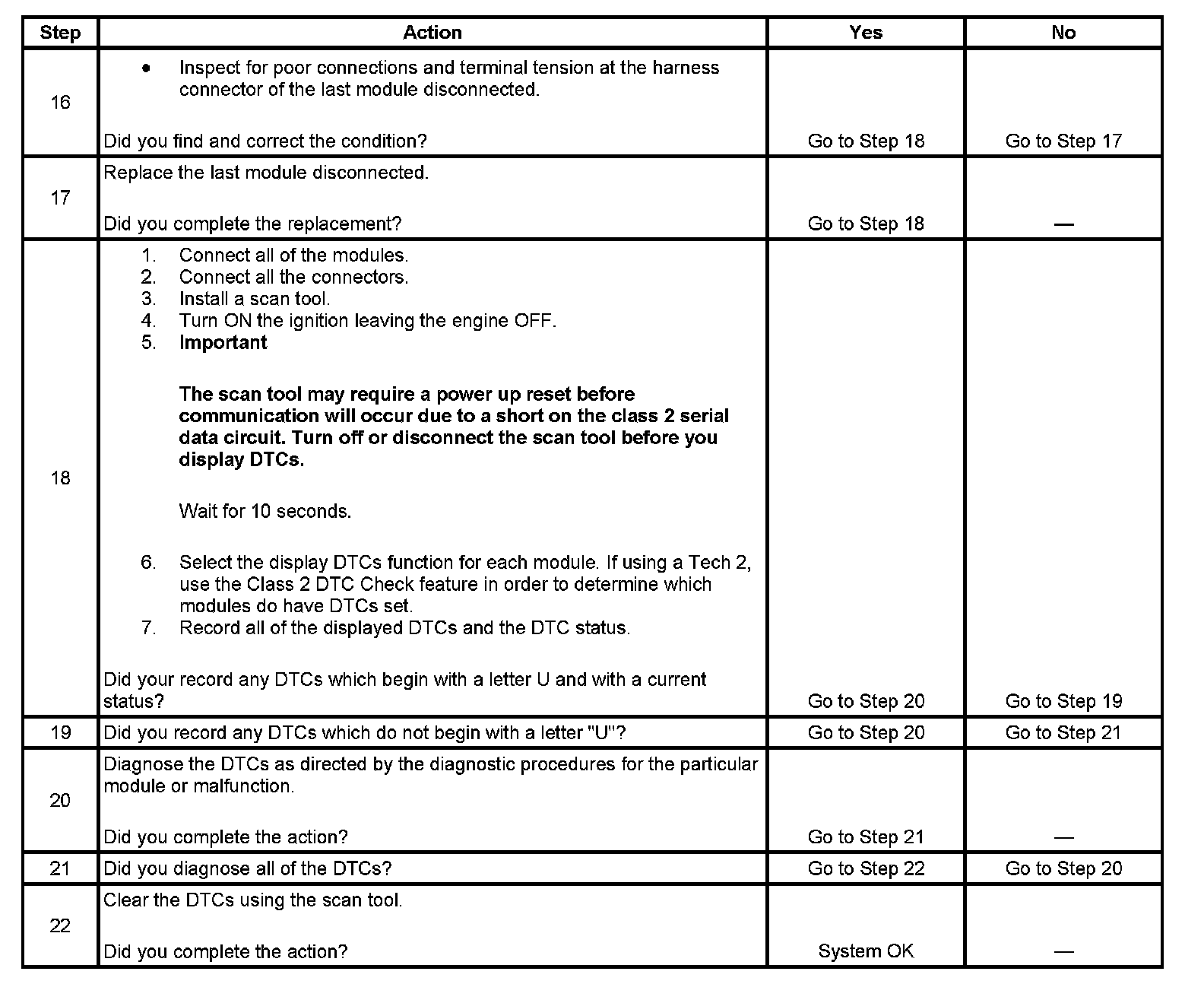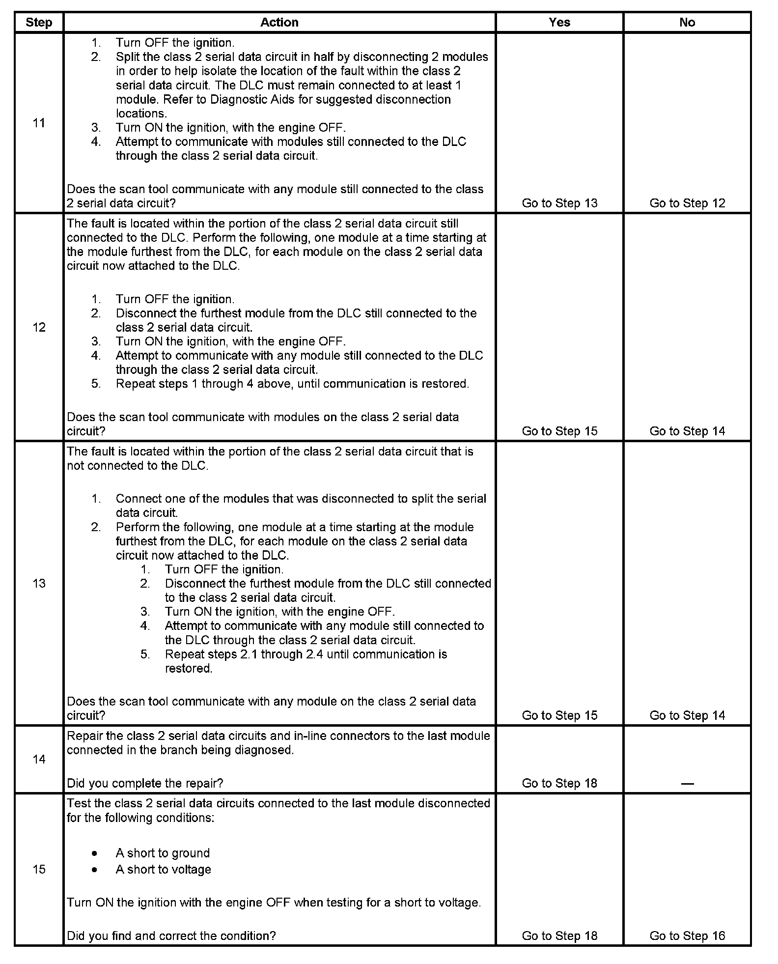 13. Splitting the class 2 serial data circuit will help isolate the location of the malfunction. If communication can be established, the malfunction is located in the wiring or one of the modules that is no longer connected to the DLC. If communication cannot be established, the malfunction is located in the wiring or one of the modules that is still connected to the DLC.