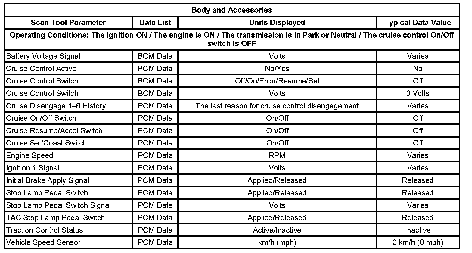 The scan tool data lists contain all of the cruise control related parameters that are available on the scan tool. The parameters in the list are arranged in alphabetical order. The data list column indicates the location of the parameter within the scan tool menu selections.
