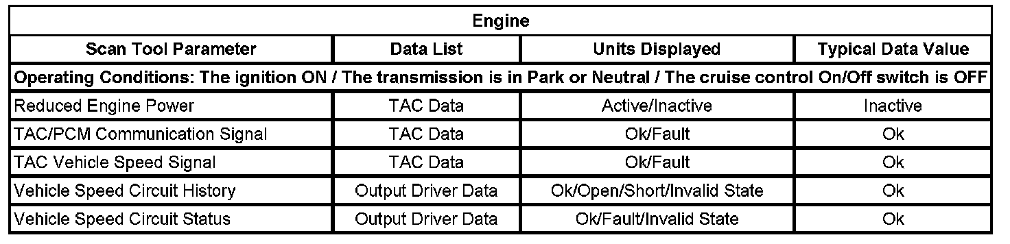 The typical data values are obtained from a properly operating vehicle under the conditions specified in the first row of the scan tool data list table. Comparison of the parameter values from the suspect vehicle with the typical data values may reveal the source of the customer concern.