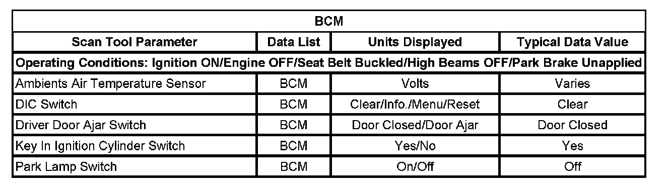 Scan Tool Data List - Body Control Module (BCM)