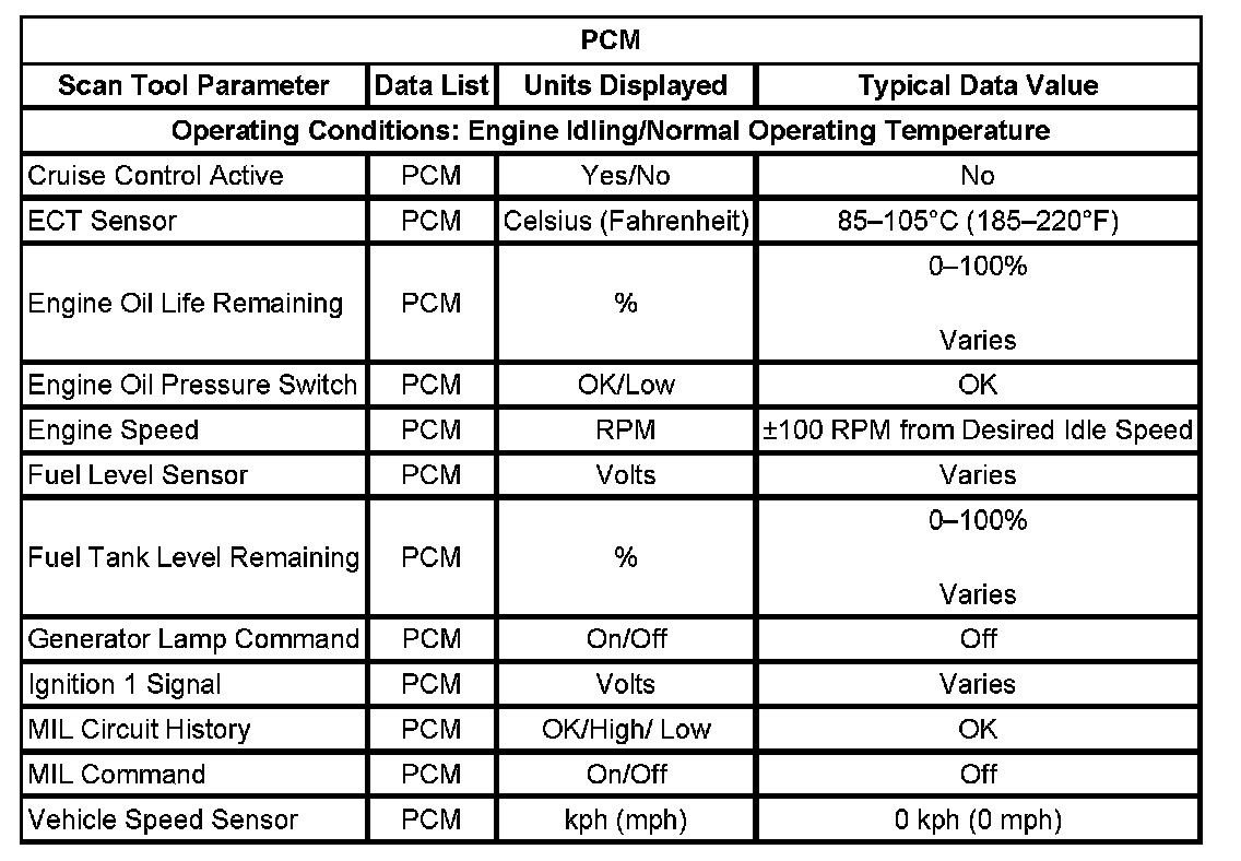 Scan Tool Data List - Powertrain Control Module (PCM)