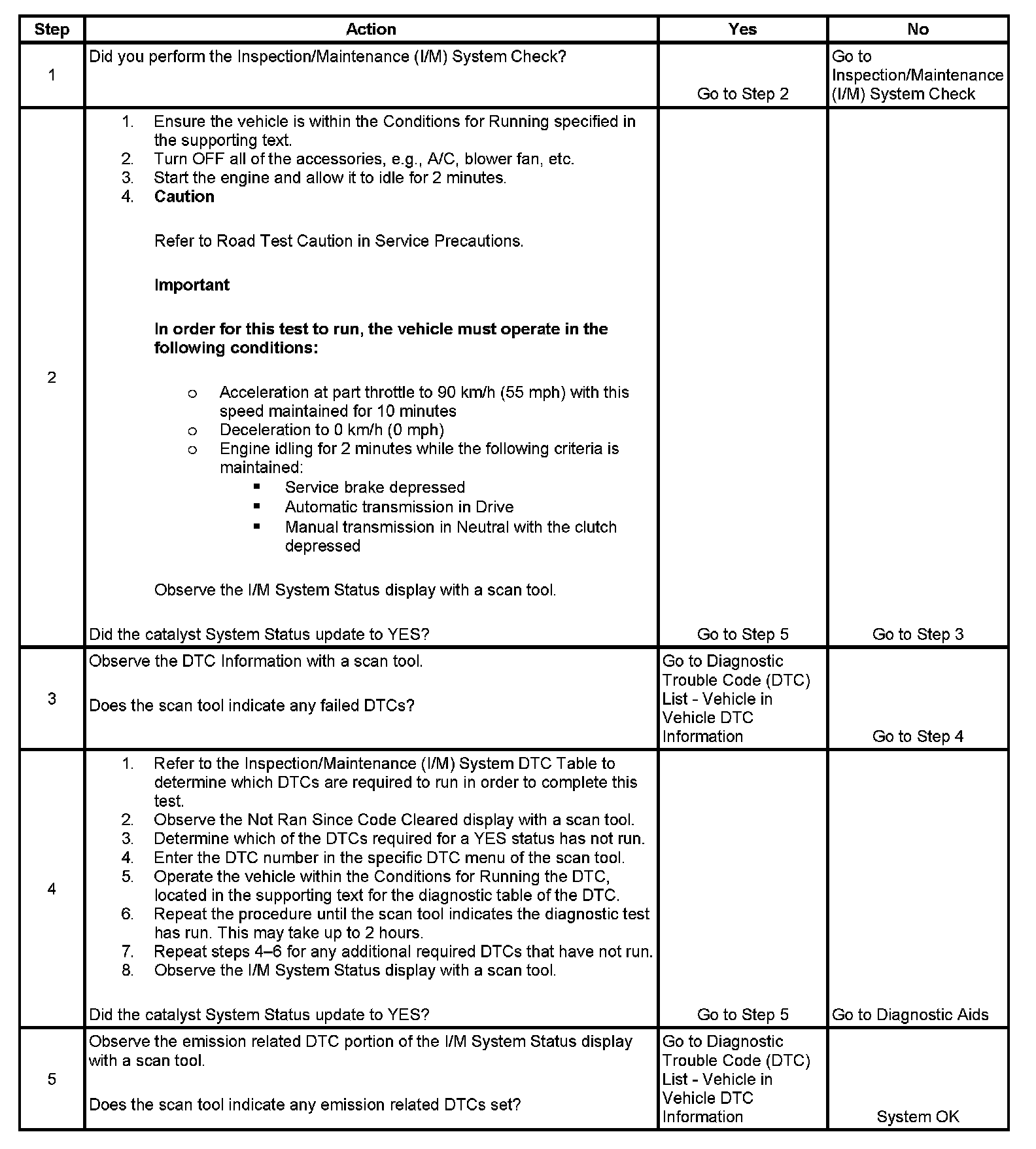 The purpose of this test is to satisfy the enable criteria necessary to execute inspection/maintenance (I/M) readiness diagnostics for the catalyst system. The test may be used to set the I/M System Status indicators to YES. The I/M System Status display on the scan tool provides an indication of whether the control module has completed the required tests. The I/M System Status does not indicate that the tests have passed or failed. When all of the diagnostics for a specific system have run and passed, the I/M System Status will update to YES. If a test for a specific system has failed, the I/M System Status will update to YES, indicating a determination was made even if all of the other tests for that system have not run.