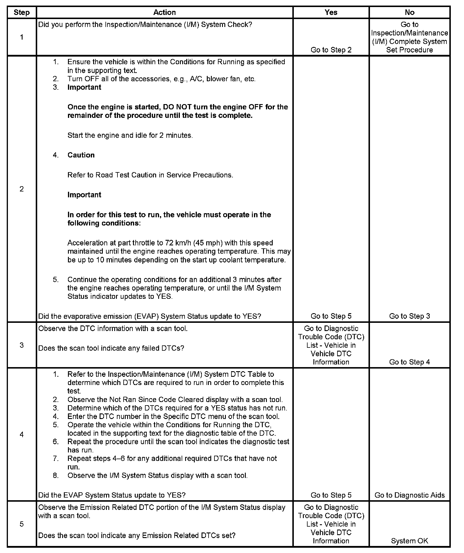 The purpose of this test is to satisfy the enable criteria necessary to execute inspection/maintenance (I/M) readiness diagnostics for the evaporative emission (EVAP) system. The test may be used to set the I/M System Status indicators to YES. The I/M System Status display on the scan tool provides an indication of when the control module has completed the required tests. The I/M System Status does not indicate that the tests have passed or failed. When all of the diagnostics for a specific system have run and passed, the I/M System Status will update to YES. If a test for a specific system has failed, the I/M System Status will update to YES, indicating a determination was made, even if all of the other tests for that system have not run. Performing a visual inspection prior to running the EVAP test may prevent having to repeat the test. A failed or aborted test will require the vehicle to cool down in order to meet the enable criteria to run another test.