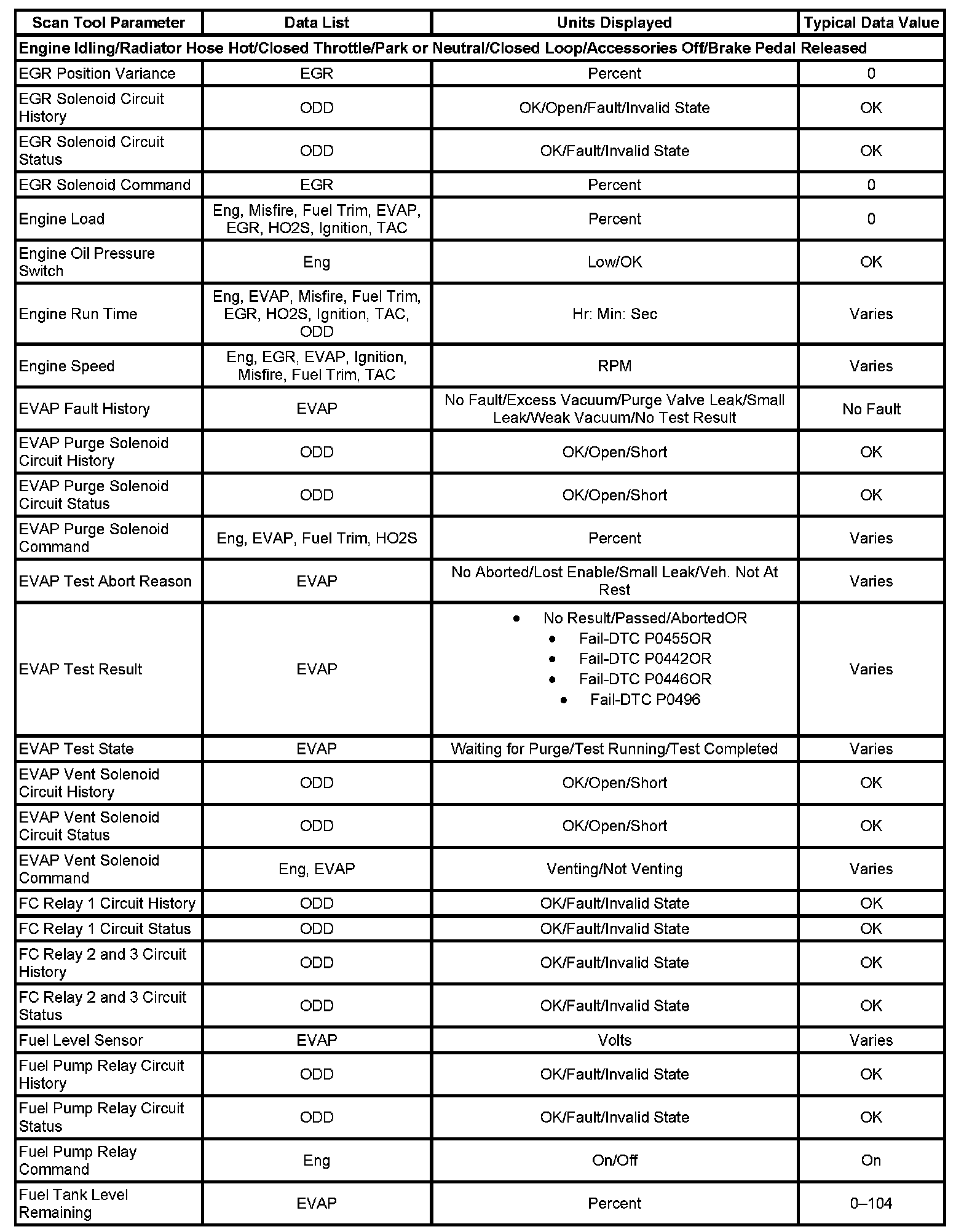The Engine Scan Tool Data List contains all engine-related parameters that are available on the scan tool. The list is arranged in alphabetical order. A given parameter may appear in any one of the data lists, and in some cases may appear more than once, or in more than one data list in order to group certain related parameters together.
