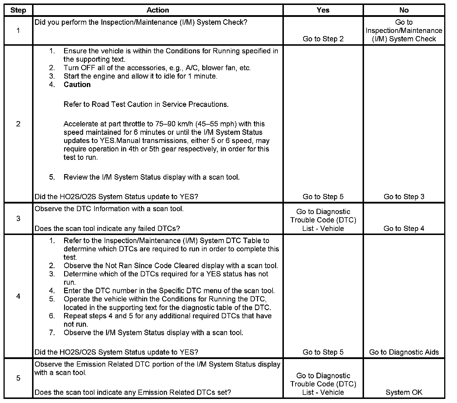 The purpose of this test is to satisfy the enable criteria necessary to execute inspection/maintenance (I/M) readiness diagnostics for the oxygen sensor (O2S, HO2S) system. The test may be used to set the I/M System Status to YES. The I/M System Status display on the scan tool provides an indication of whether the control module has completed the required tests. The I/M System Status does not indicate that the tests have passed or failed. When all of the diagnostics for a specific system have run and passed, the I/M System Status will update to YES. If a test for a specific system has failed, the I/M System Status will update to YES, indicating a determination was made, even if all of the other tests for that system have not run.