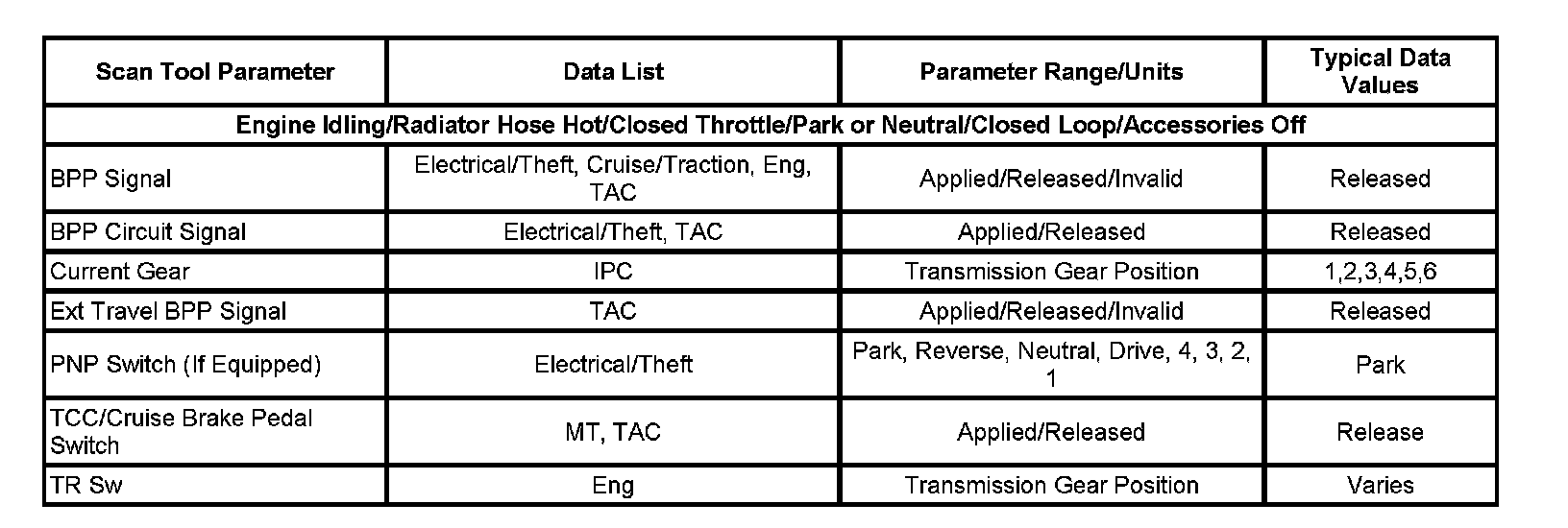 Only the parameters listed below are referenced in this service manual for use in diagnosis. If all values are within the typical range described below, refer to Symptoms - Automatic Transmission Shift Lock Control for diagnosis.