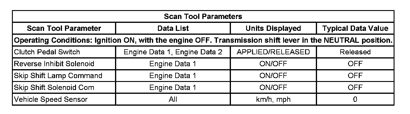 The Transmission Scan Tool Data List contains manual transmission related parameters that are available on the scan tool. The list is arranged in alphabetical order. The parameters in the Typical Scan Data values column represent values that would be seen on a normally running engine.