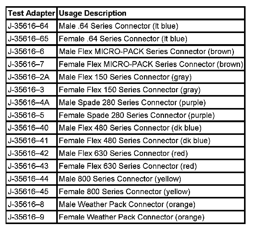 NOTE: Do not insert test equipment probes into any connector or fuse block terminal. The diameter of the test probes will deform most terminals. A deformed terminal can cause a poor connection, which can result in system failures. Always use the J 35616-B Connector Test Adapter Kit or the J 42675 Flat Wire Probe Adapter Kit in order to frontprobe terminals. Do not use paper clips or other substitutes as they can damage terminals and cause incorrect measurements.