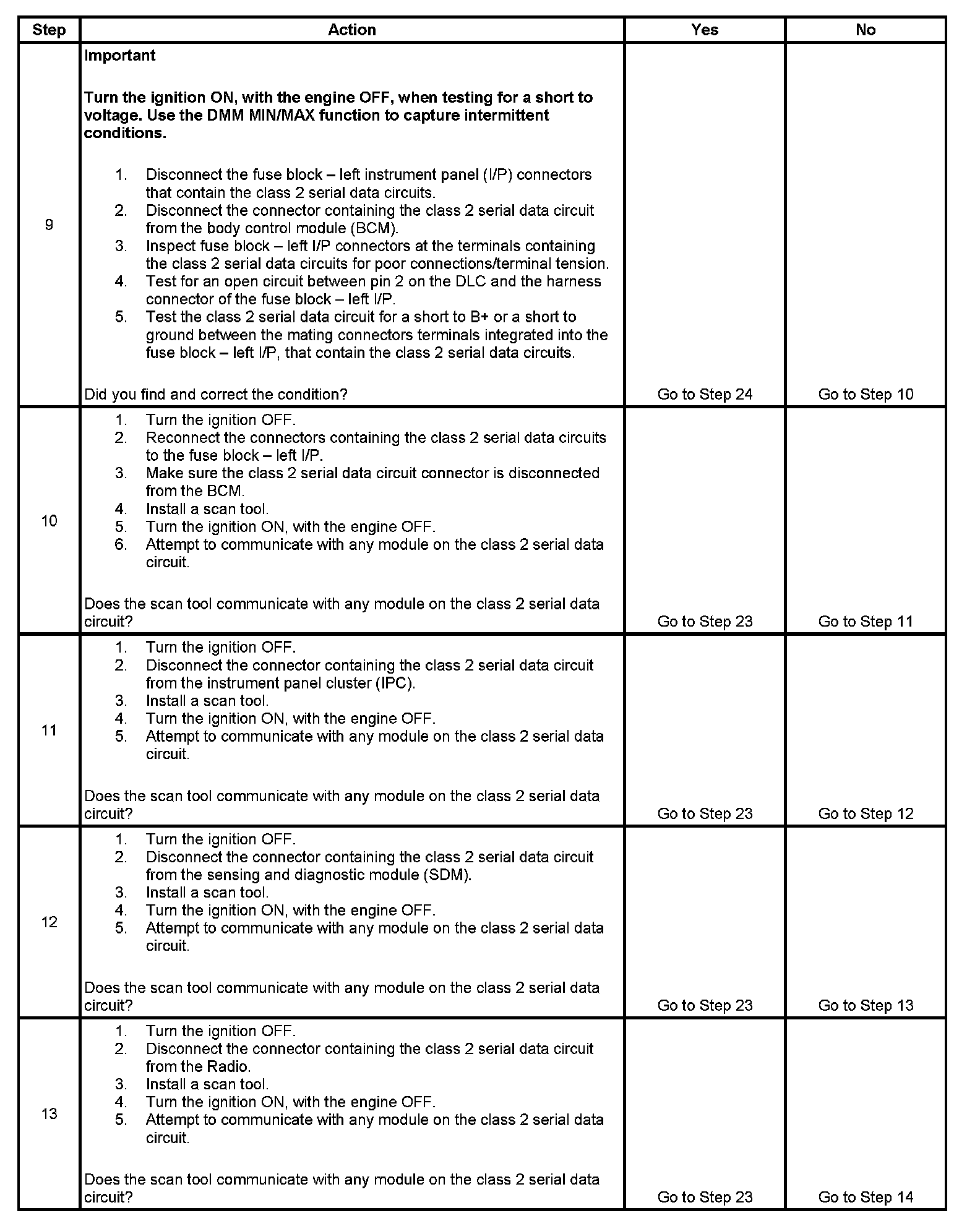 12. This is an active test of the class 2 serial data circuit with the SDM isolated from the communication bus. If you are able to communicate with the class 2 serial data circuit during this step, the SDM should be replaced.