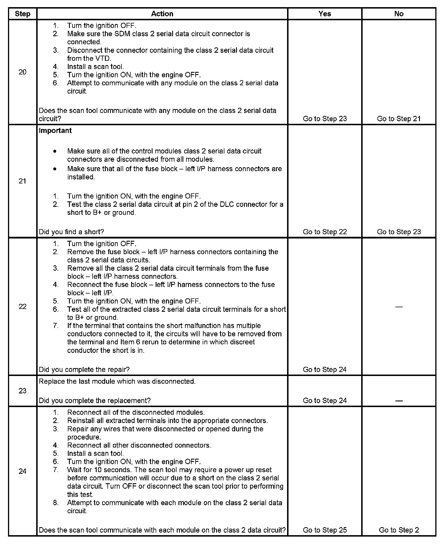 20. This is an active test of the class 2 serial data circuit with the VTD, if the vehicle is equipped, isolated from the communication bus. If you are able to communicate with the class 2 serial data circuit during this step, the VTD should be replaced.