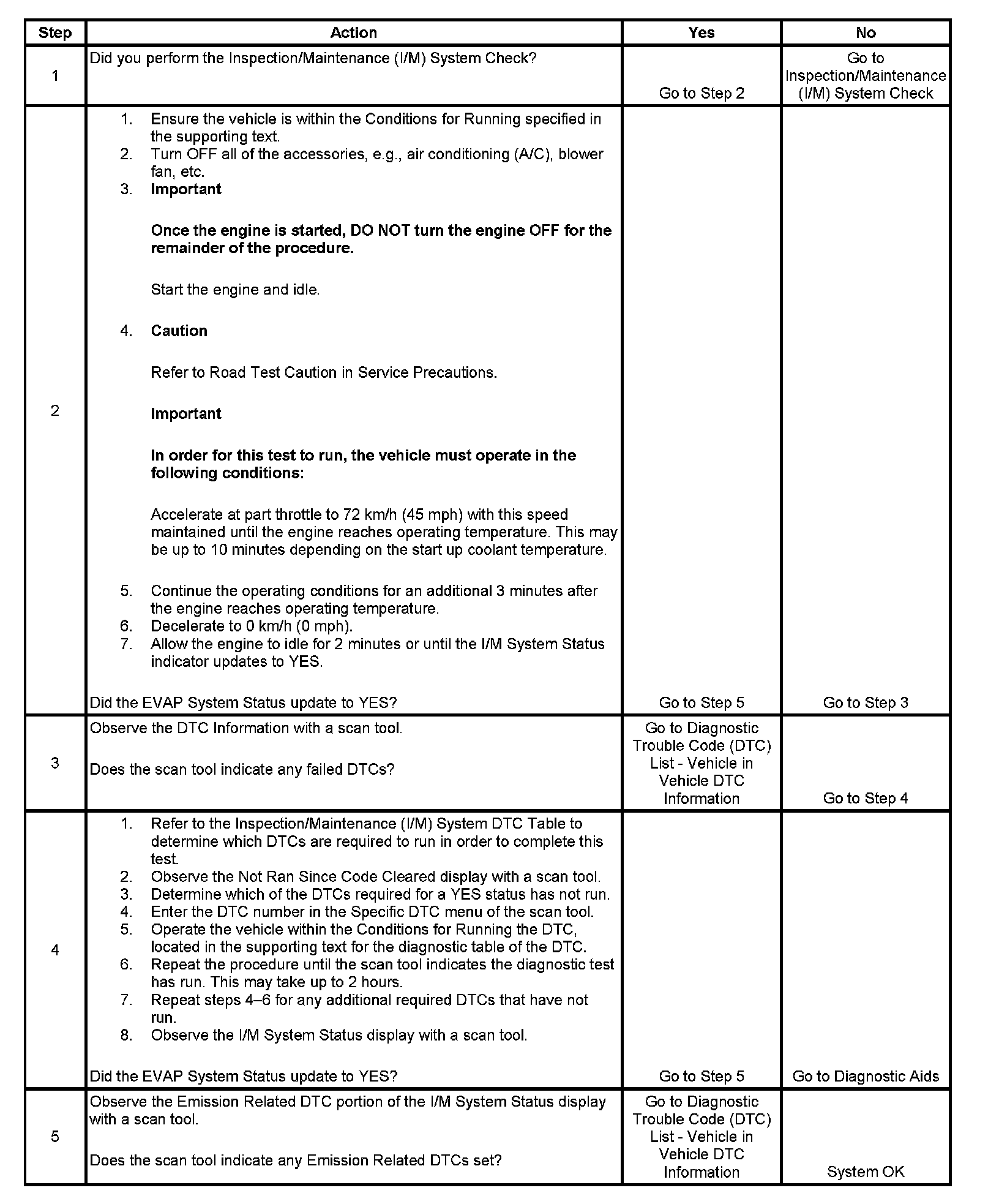 The purpose of this test is to satisfy the enable criteria necessary to execute inspection/maintenance (I/M) readiness diagnostics for the evaporative emission (EVAP) system. The test may be used to set the I/M System Status indicators to YES. The I/M System Status Display on the scan tool provides an indication of whether the control module has completed the required tests. The I/M System Status does not indicate that the tests have passed or failed. When all of the diagnostics for a specific system have run and passed the I/M System Status will update to YES. If a test for a specific system has failed, the I/M System Status will update to YES, indicating a determination was made, even if all of the other tests for that system have not run. Performing a visual inspection prior to running the EVAP test may prevent having to repeat the test. A failed or aborted test will require the vehicle to cool down in order to meet the enable criteria to run another test.
