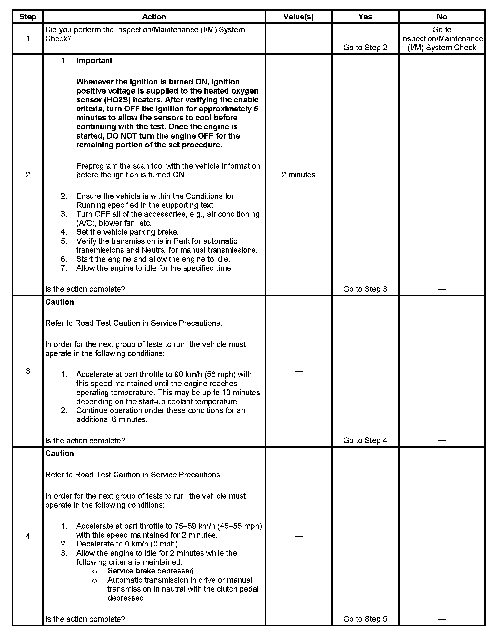 The purpose of the inspection/maintenance (I/M) Complete System Set Procedure is to satisfy the enable criteria necessary to execute all of the I/M readiness diagnostics, and complete the trips for those particular diagnostics. When all diagnostic tests are completed, the I/M System Status indicators are set to YES. Perform this procedure when more than one of the I/M System Status indicators are set to NO.