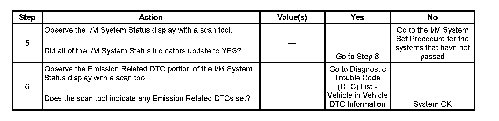 6. The I/M System Status only reports on whether or not a diagnostic has run, not what the outcome of the test was. If any emission related DTC sets after the tests are complete, the DTC will require diagnosis.