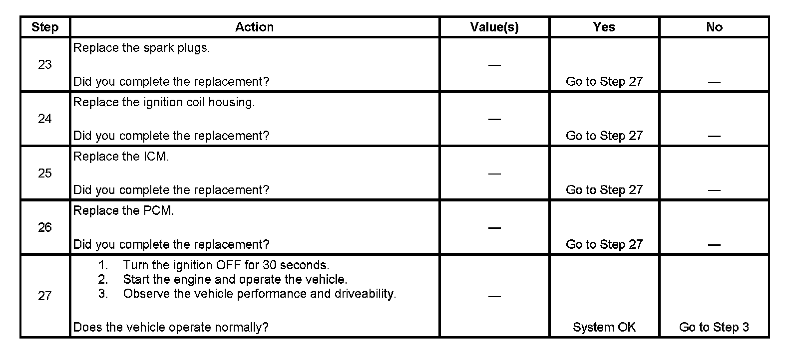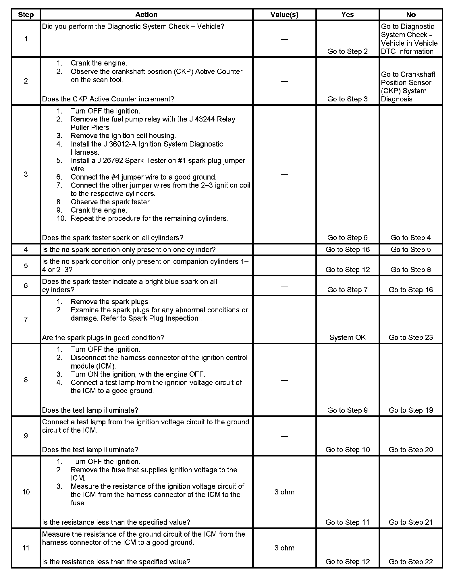 Each ignition coil supplies secondary voltage to a pair of spark plugs. This is called a waste spark ignition system. The powertrain control module (PCM) supplies a signal on each of the ignition control (IC) timing control circuits to the ignition control module (ICM). The ICM fires the correct ignition coil at the correct time based on the signals. The ICM detects if cylinder 1 or cylinder 3 is on the compression stroke by sensing the secondary voltage and polarity of each side of the ignition coil. The ICM detects this voltage with sensing circuitry integrated into each ignition coil. The higher voltage is on the compressing cylinder. This is called compression sense ignition. The ICM provides a synthesized cam signal to the PCM based on these inputs. The PCM uses the cam signal to synchronize fuel injection.