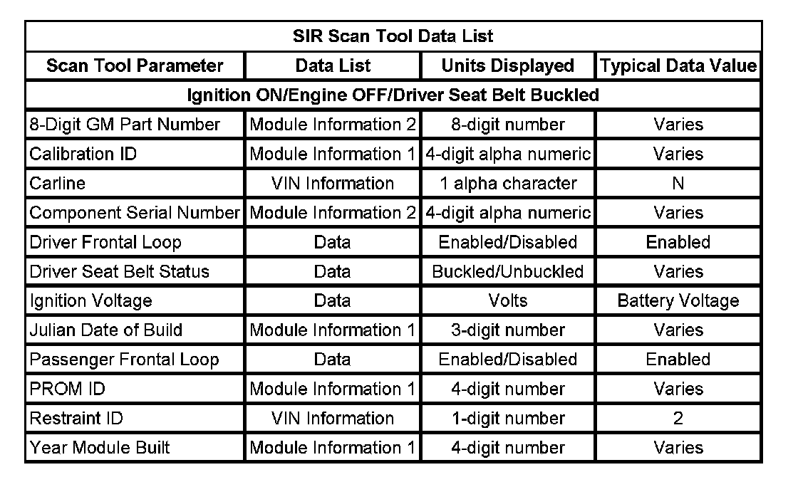 Use the SIR Scan Tool Data List as directed by a diagnostic table or in order to supplement the diagnostic procedures. Begin all of the diagnostic procedures with the SIR Diagnostic System Check. Use the SIR Scan Tool Data List after the following is determined: