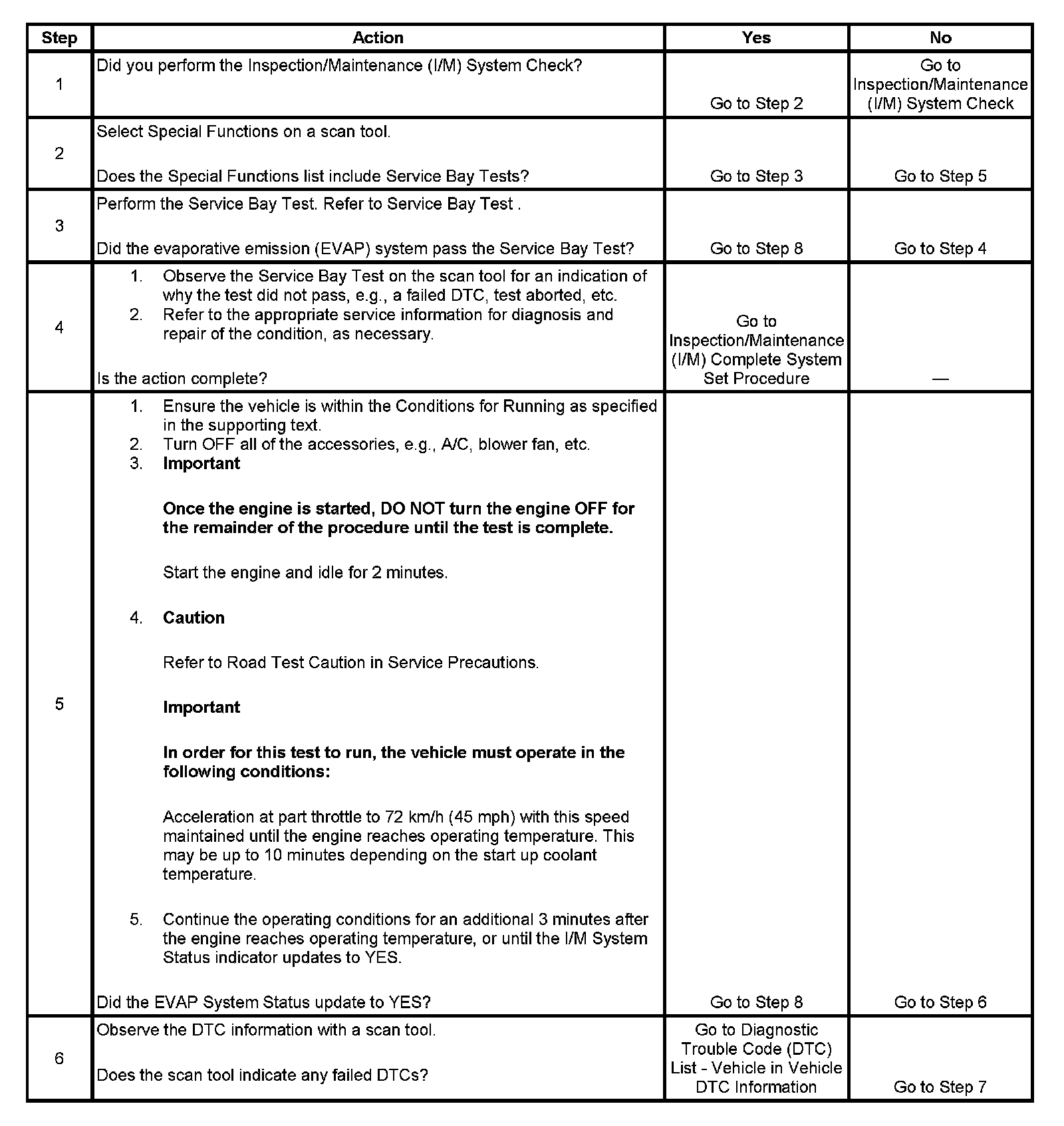 The purpose of this test is to satisfy the enable criteria necessary to execute inspection/maintenance (I/M) readiness diagnostics for the evaporative emission (EVAP) system. The test may be used to set the I/M System Status indicators to YES. The I/M System Status display on the scan tool indicates whether or not the control module has completed the required test. The required test is complete when either all of the DTCs comprising the test have run and passed, or when any one of the DTCs comprising the test has illuminated the malfunction indicator lamp (MIL). Once the test is complete, the I/M System Status display will indicate YES in the completed column. Performing a visual inspection prior to running the EVAP test may prevent having to repeat the test due to the fact that a failed or aborted test will require the vehicle to cool down in order to meet the enable criteria to run another test.