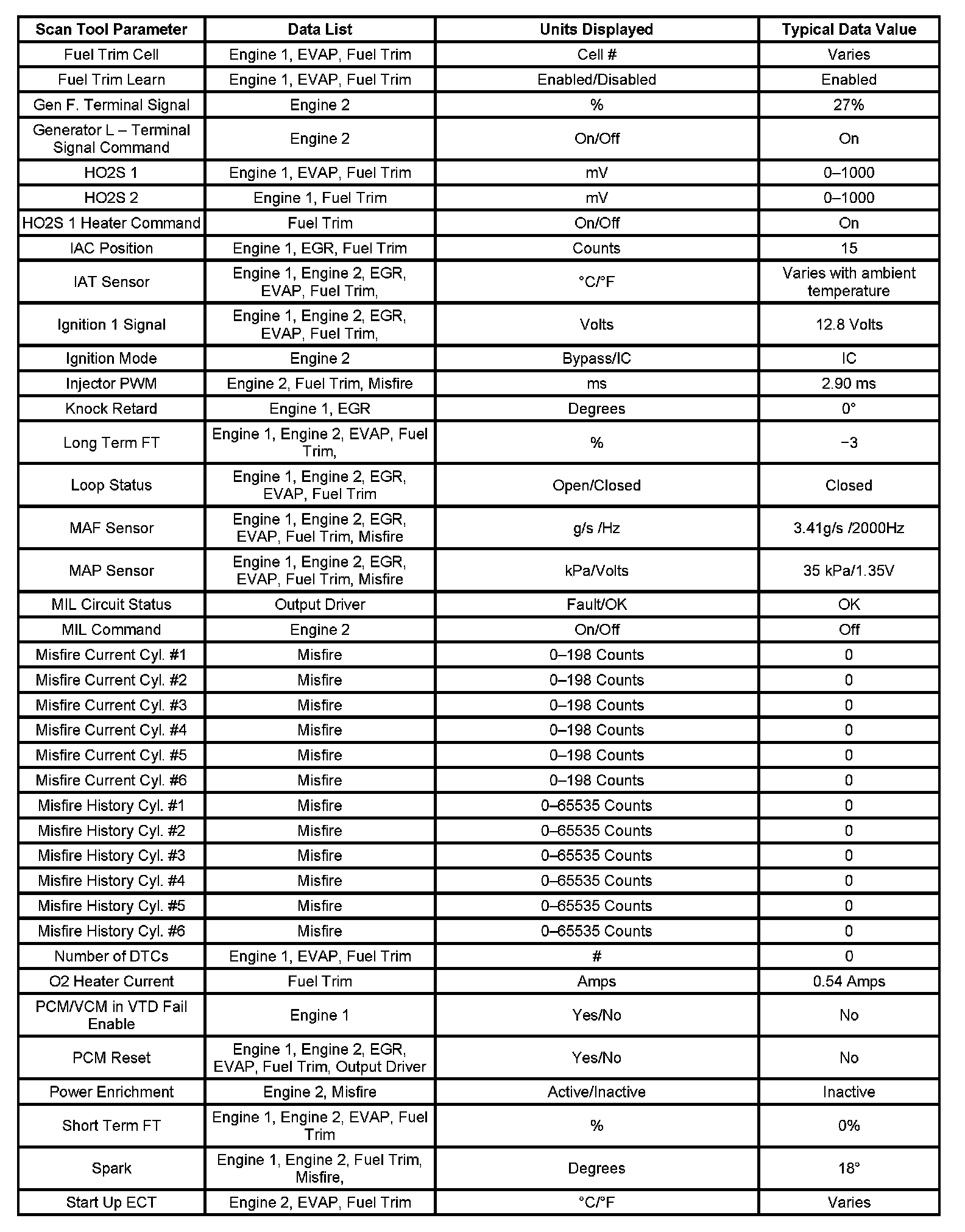- Engine Data 2-Contains general information regarding engine coolant temperature (ECT), intake air temperature (IAT), mass air flow (MAF), manifold absolute pressure (MAP), and other basic engine operating conditions.