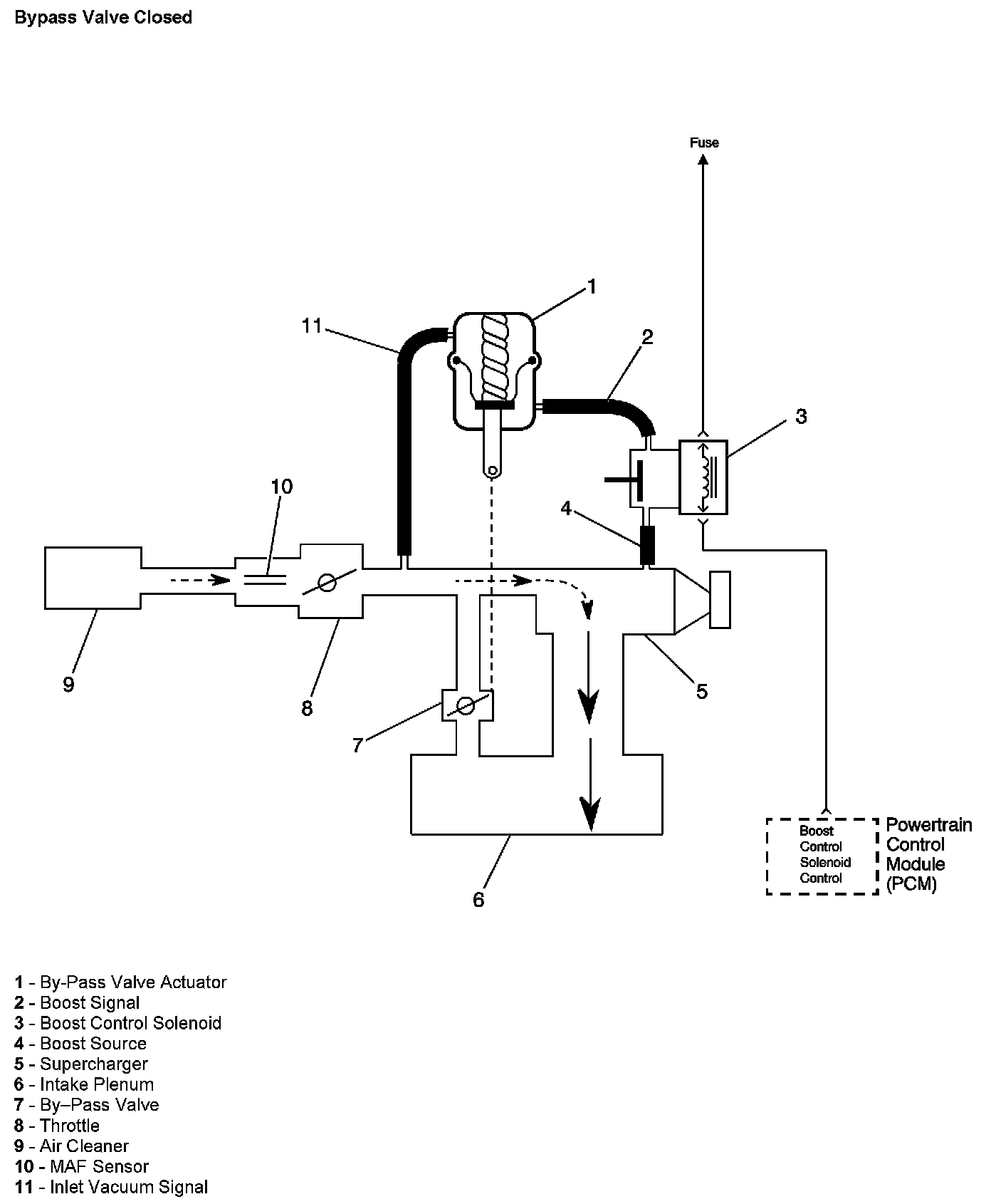 The PCM controls boost pressure by using the boost control solenoid. The boost control solenoid is normally an open valve. Under most conditions, the PCM commands the boost control solenoid to operate at a 100 percent duty cycle. This keeps the solenoid valve closed and allows only inlet vacuum to control the position of the bypass valve. At idle, engine vacuum is applied to the upper side of the bypass valve actuator, counteracting spring tension to hold the bypass valve open. As engine load is increased, engine vacuum is decreased, causing the spring in the bypass valve actuator to overcome the applied vacuum, closing the bypass valve and allowing the boost pressure to increase. When reduced boost pressure is desired, the PCM commands the boost control solenoid to operate at a 0 percent duty cycle. This opens the solenoid valve and allows boost pressure to enter the bypass valve actuator at the lower side to counteract the spring tension, opening the bypass valve and recirculating excess boost pressure back into the supercharger inlet.