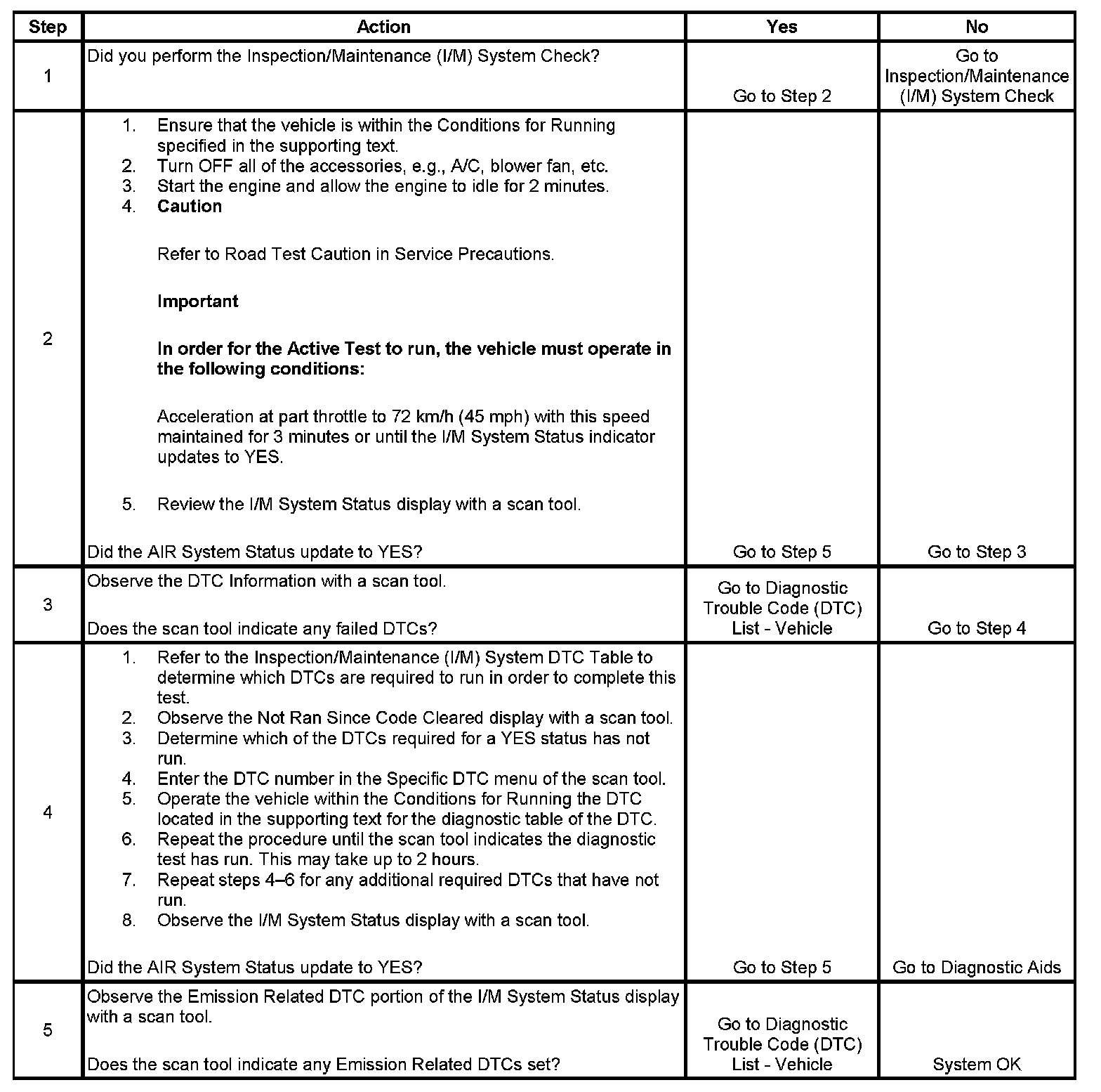 The purpose of this test is to satisfy the enable criteria necessary to execute inspection/maintenance (I/M) readiness diagnostics for the secondary air injection (AIR) system. The test may be used to set the I/M System Status to YES. The I/M System Status display on the scan tool provides an indication of whether the control module has completed the required tests. The I/M System Status does not indicate that the tests have passed or failed. When all of the diagnostics for a specific system have run and passed, the I/M System Status will update to YES. If a test for a specific system has failed, the I/M System Status will update to YES, indicating a determination was made, even if all of the other tests for that system have not run.