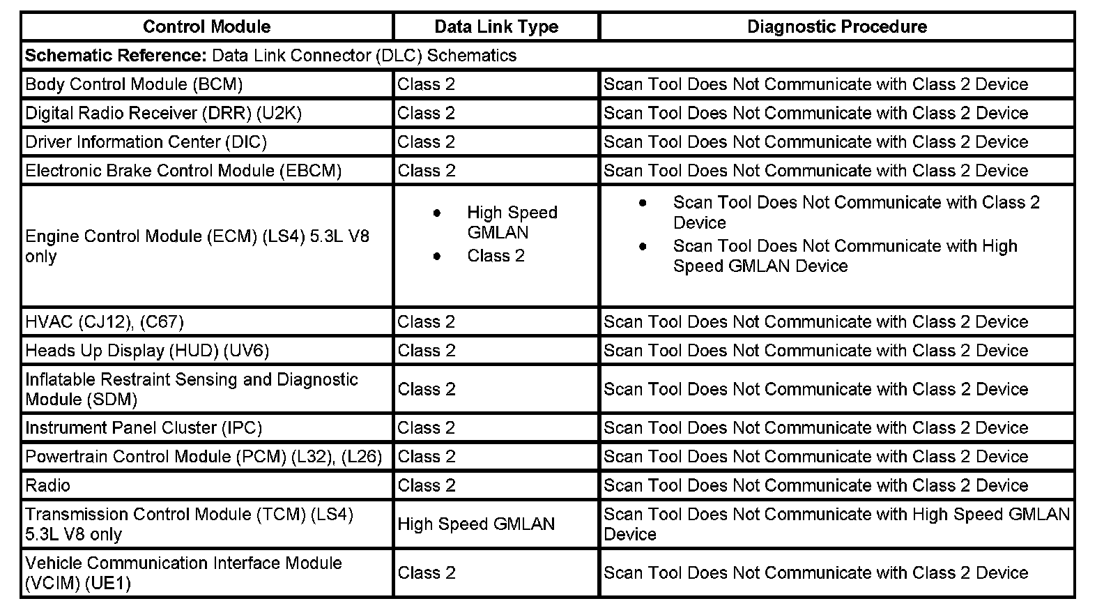 This table identifies which serial data link that a particular module uses for in-vehicle data transmission. Some modules may use more than one data link to communicate. Some modules may have multiple communication circuits passing through them without actively communicating on that data link. This table is used to assist in correcting a communication malfunction. For the description and operation of these serial data communication circuits refer to Data Link Communications Description and Operation.