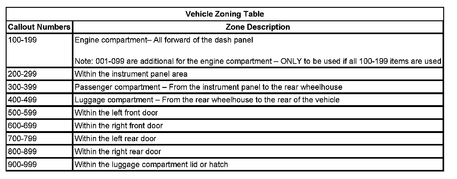 All grounds, in-line connectors, pass-through grommets, and splices have identifying numbers that correspond to where they are located in the vehicle. The shown table explains the numbering system.