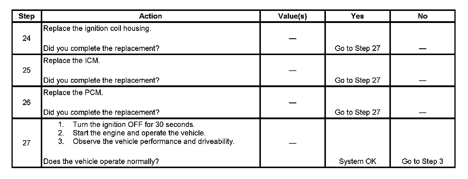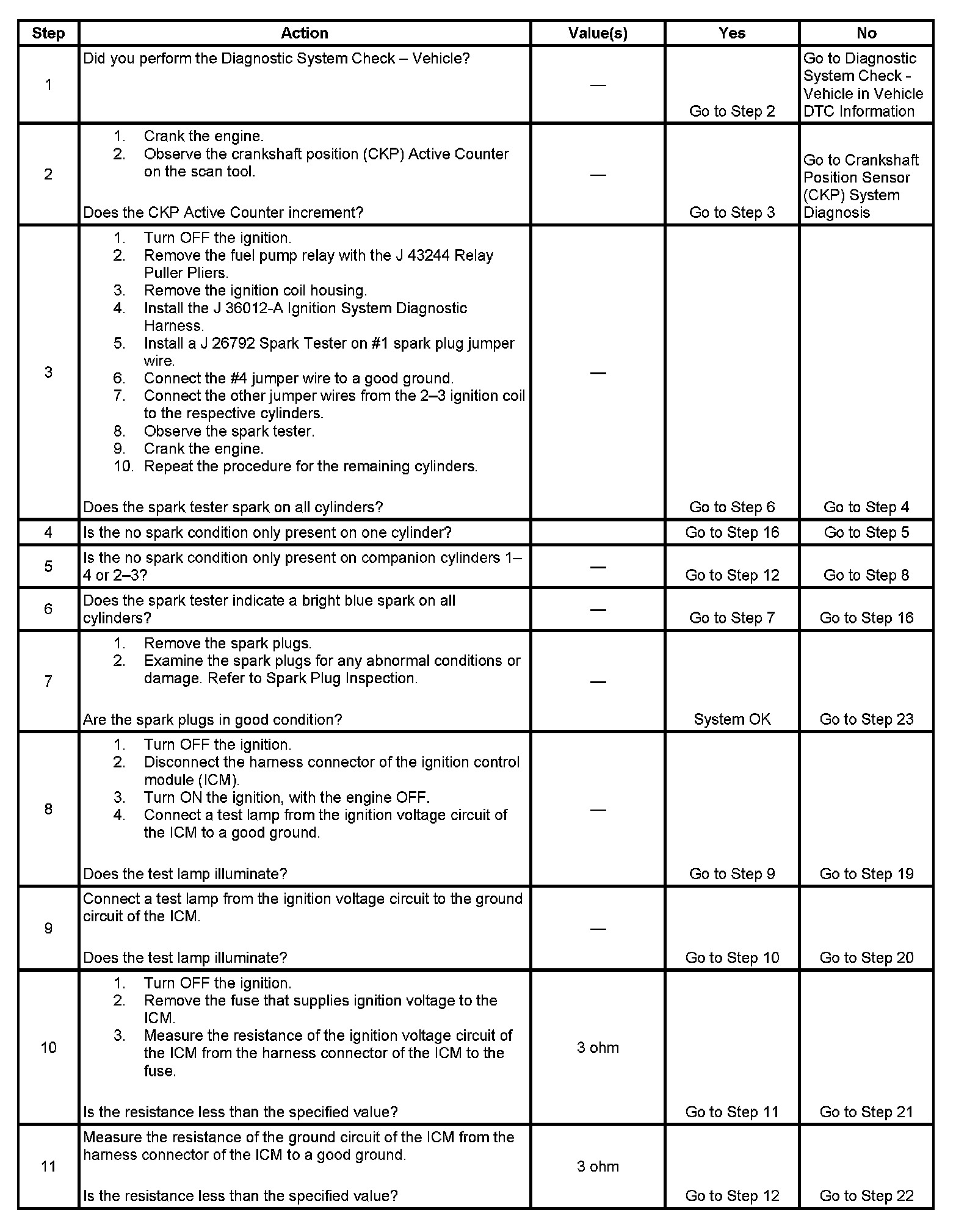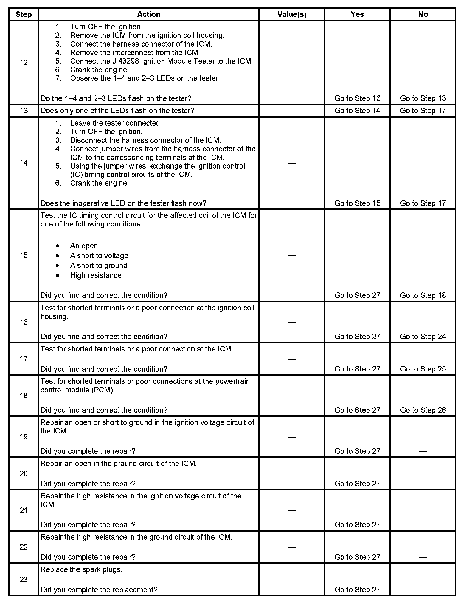 Each ignition coil supplies secondary voltage to a pair of spark plugs. This is called a waste spark ignition system. The powertrain control module (PCM) supplies a signal on each of the ignition control (IC) timing control circuits to the ignition control module (ICM). The ICM fires the correct ignition coil at the correct time based on the signals. The ICM detects if cylinder 1 or cylinder 3 is on the compression stroke by sensing the secondary voltage and polarity of each side of the ignition coil. The ICM detects this voltage with sensing circuitry integrated into each ignition coil. The higher voltage is on the compressing cylinder. This is called compression sense ignition. The ICM provides a synthesized cam signal to the PCM based on these inputs. The PCM uses the cam signal to synchronize fuel injection.