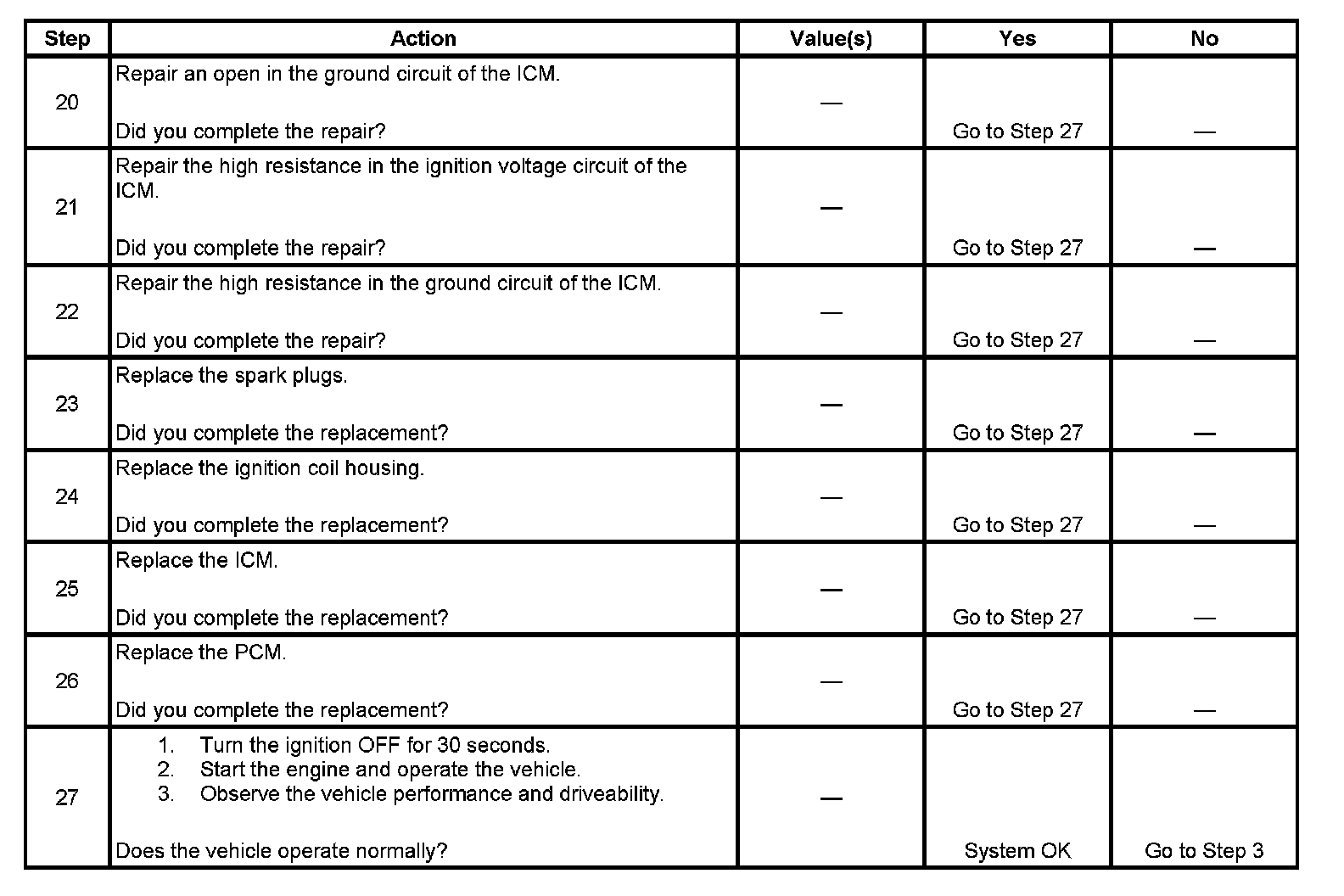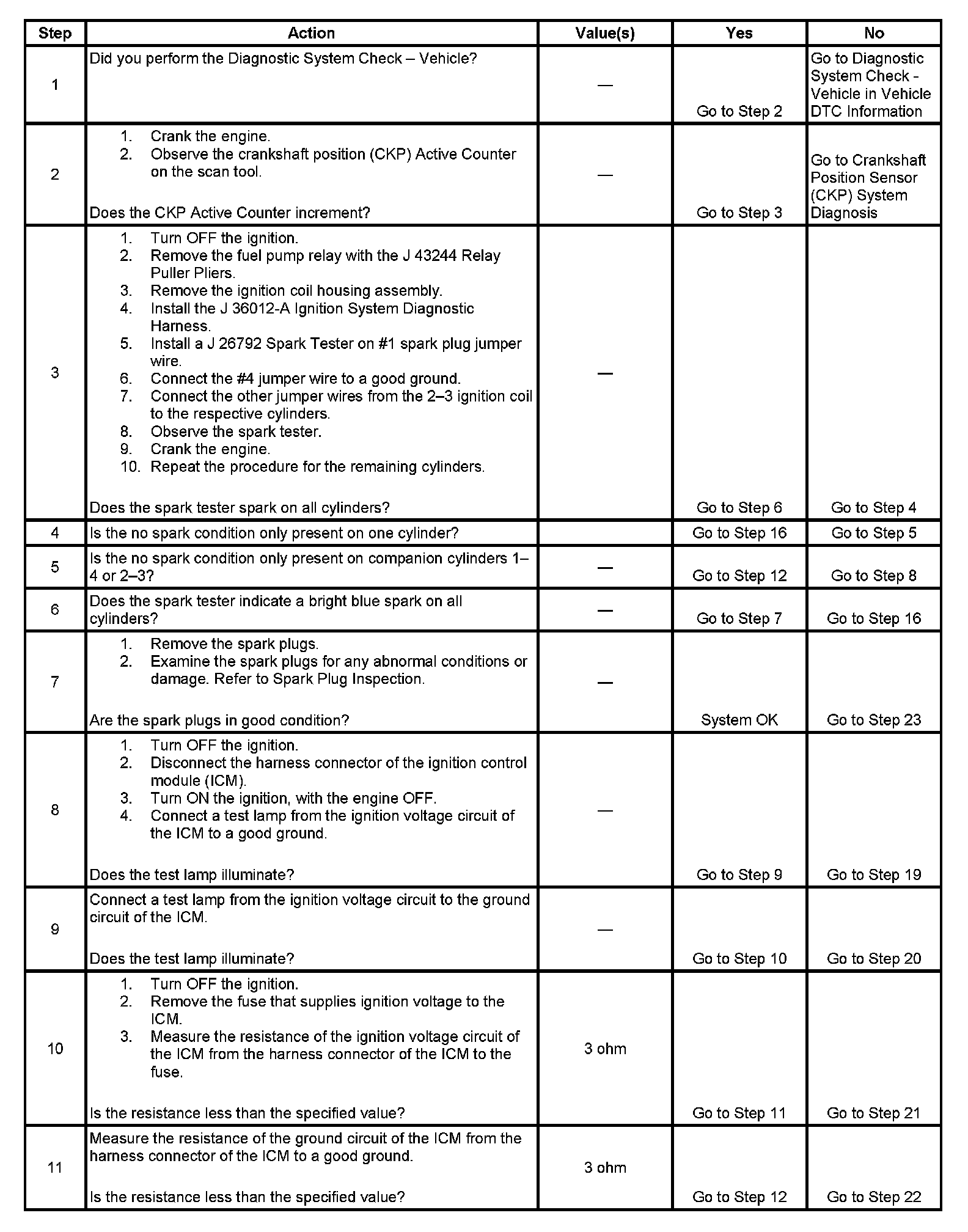 Each ignition coil supplies secondary voltage to a pair of spark plugs. This is called a waste spark ignition system. The powertrain control module (PCM) supplies a signal on each of the ignition control (IC) timing control circuits to the ignition control module (ICM). The ICM fires the correct ignition coil at the correct time based on the signals. The ICM detects if cylinder 1 or cylinder 3 is on the compression stroke by sensing the secondary voltage and polarity of each side of the ignition coil. The ICM detects this voltage with sensing circuitry integrated into each ignition coil. The higher voltage is on the compressing cylinder. This is called compression sense ignition. The ICM provides a synthesized cam signal to the PCM based on these inputs. The PCM uses the cam signal to synchronize fuel injection.