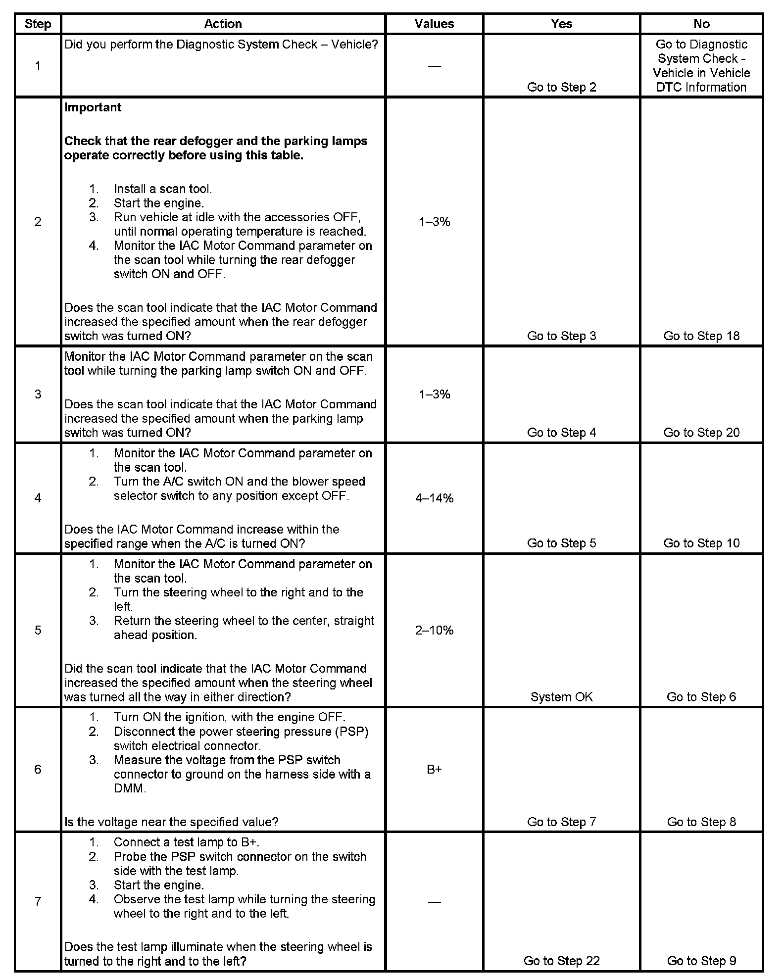 5. This step verifies the operation of the power steering pressure (PSP) switch circuit. If the engine idle speed and IAC Motor Command increase when the steering wheel is turned to 90 percent, the PSP switch idle circuit is functioning normally.