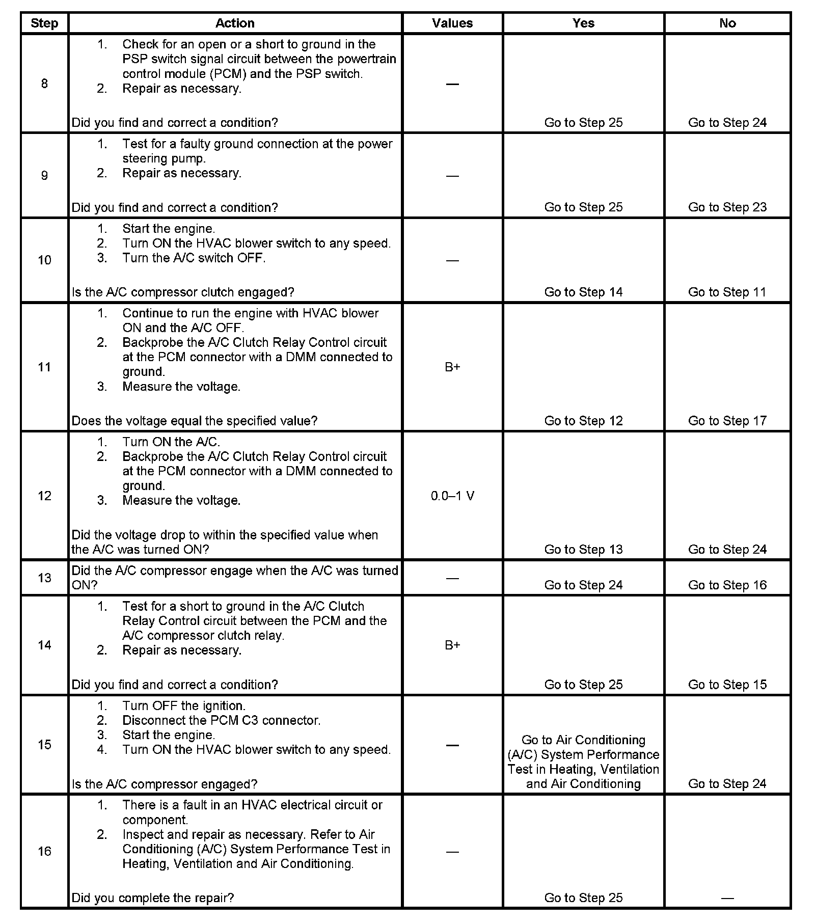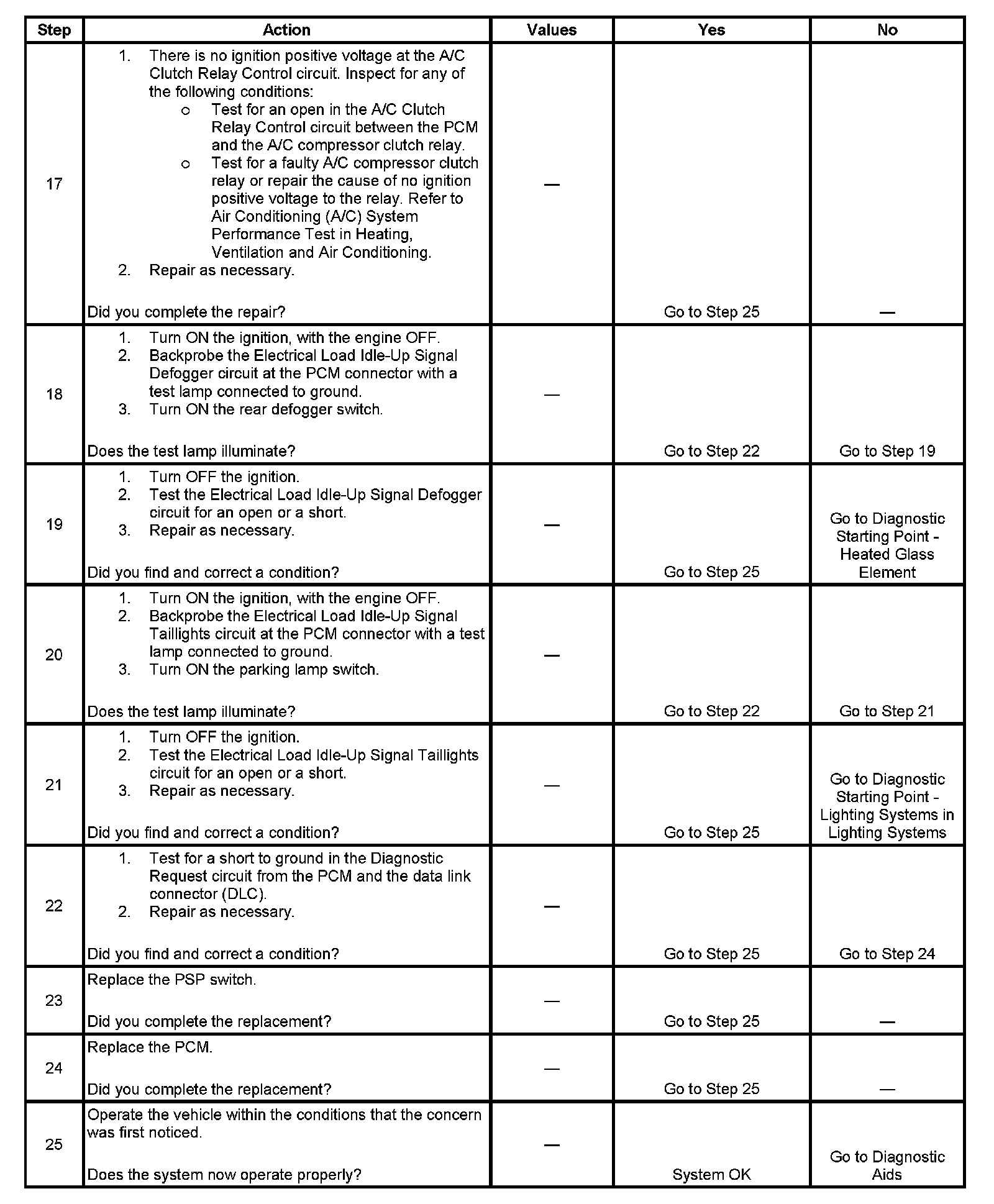 13. If the A/C compressor clutch engages, the compressor clutch, the relay, and the control circuit are all OK. The PCM will then need to be replaced because there was no increase in the IAC motor command percentage during A/C operation in Step 4.