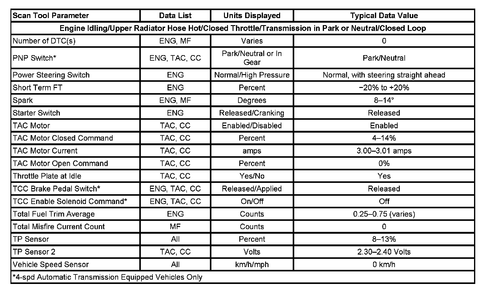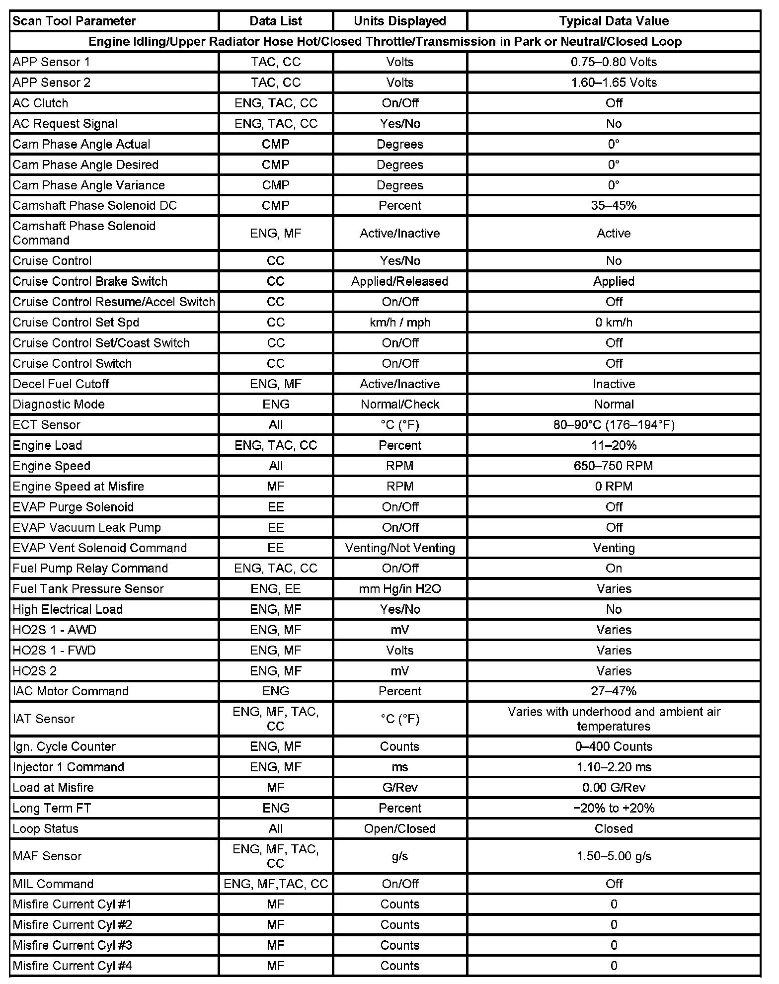 Scan tool values from a properly running engine may be used for comparison with the engine you are diagnosing. The Engine Scan Tool Data List represents values that would be seen on a normally running engine.