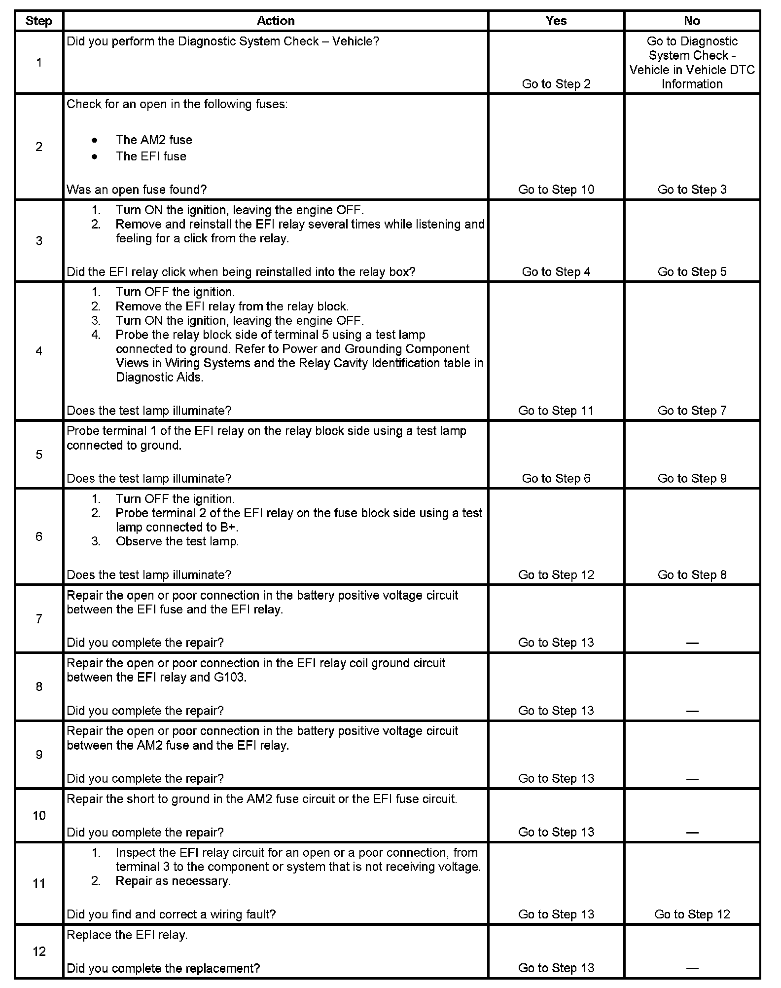 An intermittent malfunction may be caused by a fault in the EFI relay electrical circuit. Inspect the wiring harness and components for an intermittent condition. Refer to Intermittent Conditions. Intermittent Conditions