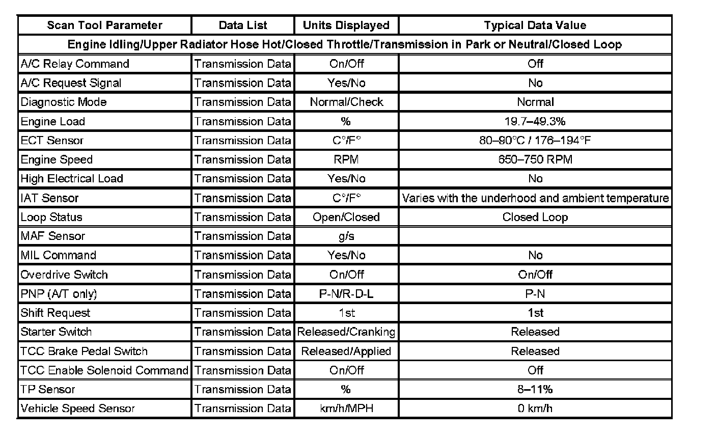 Scan tool values from a properly running Transmission may be used for comparison with the Transmission you are diagnosing. The Transmission Scan Tool Data List represents values that would be seen on a normal running engine.