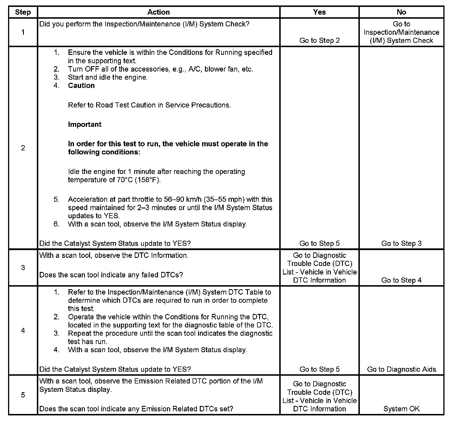 5. The I/M System Status only reports on whether or not a diagnostic has run, not what the outcome of the test was. If any Emission Related DTC sets after the tests are complete, the DTC will require diagnosis.