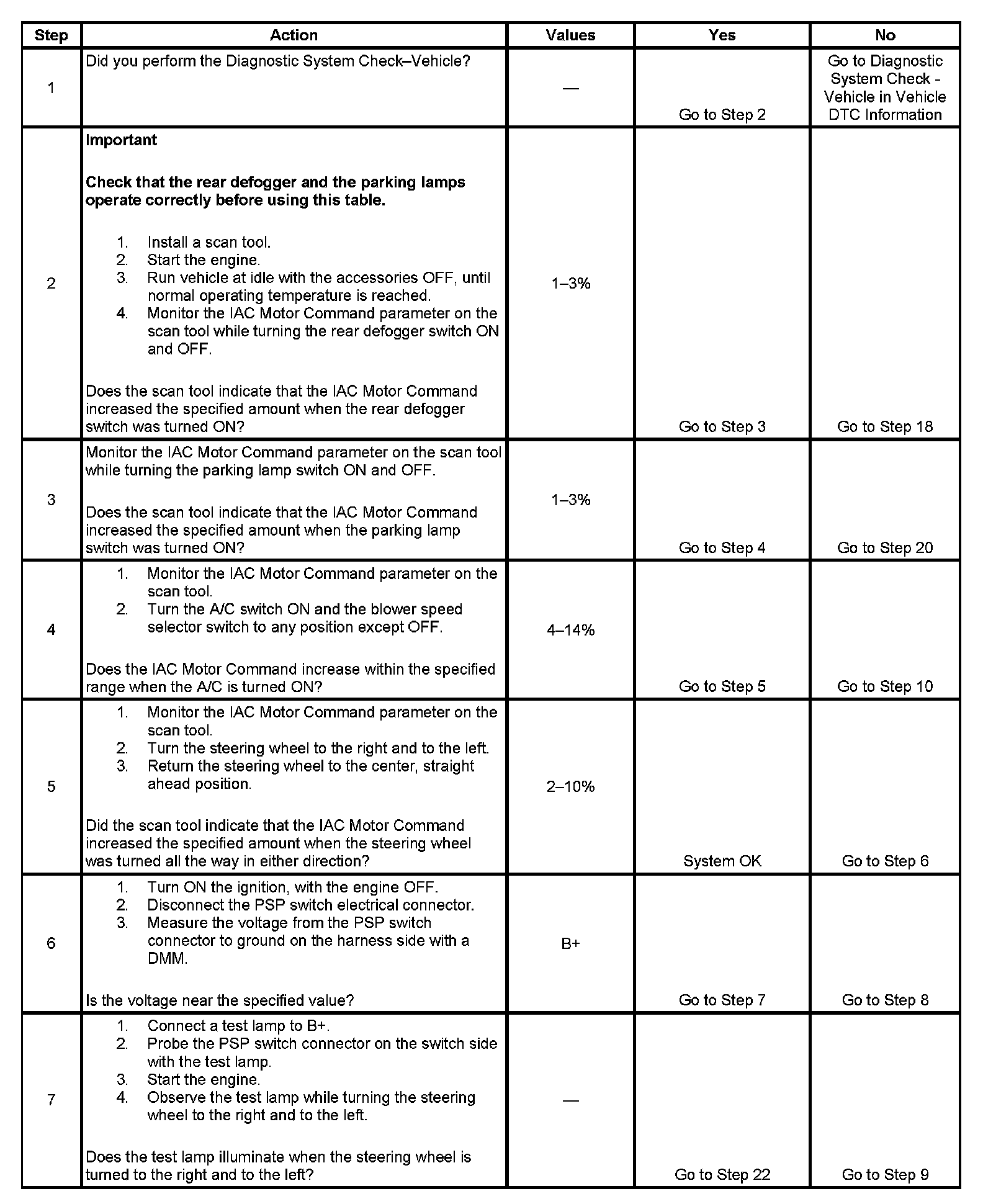5. This step verifies the operation of the power steering pressure (PSP) switch circuit. If the engine idle speed and IAC Motor Command increase when the steering wheel is turned to 90 percent, the PSP switch idle circuit is functioning normally.