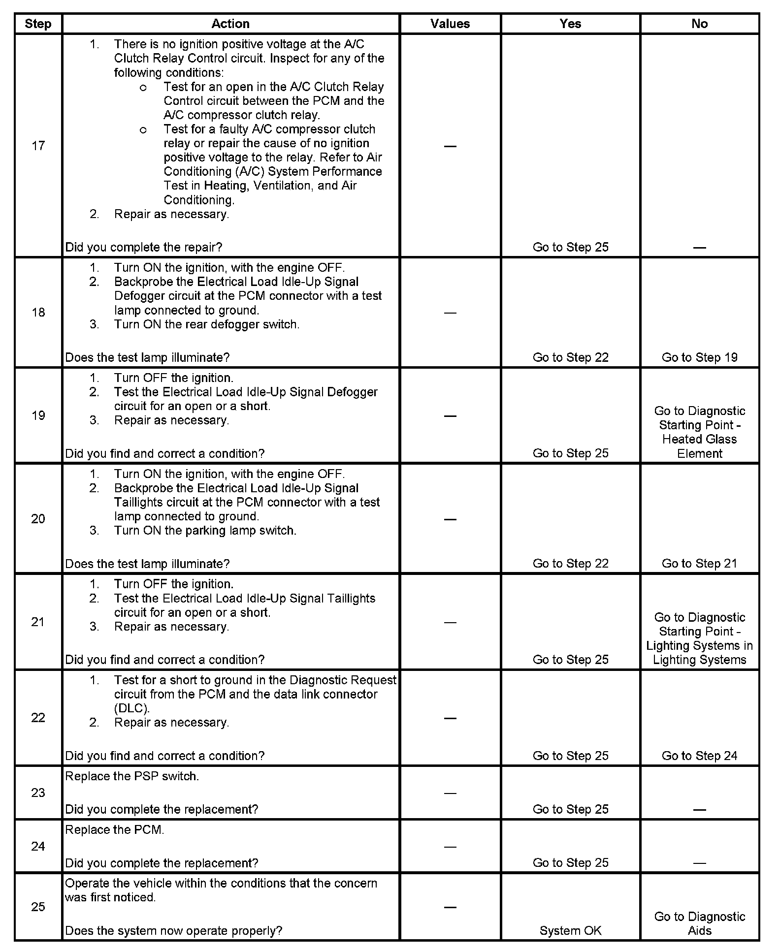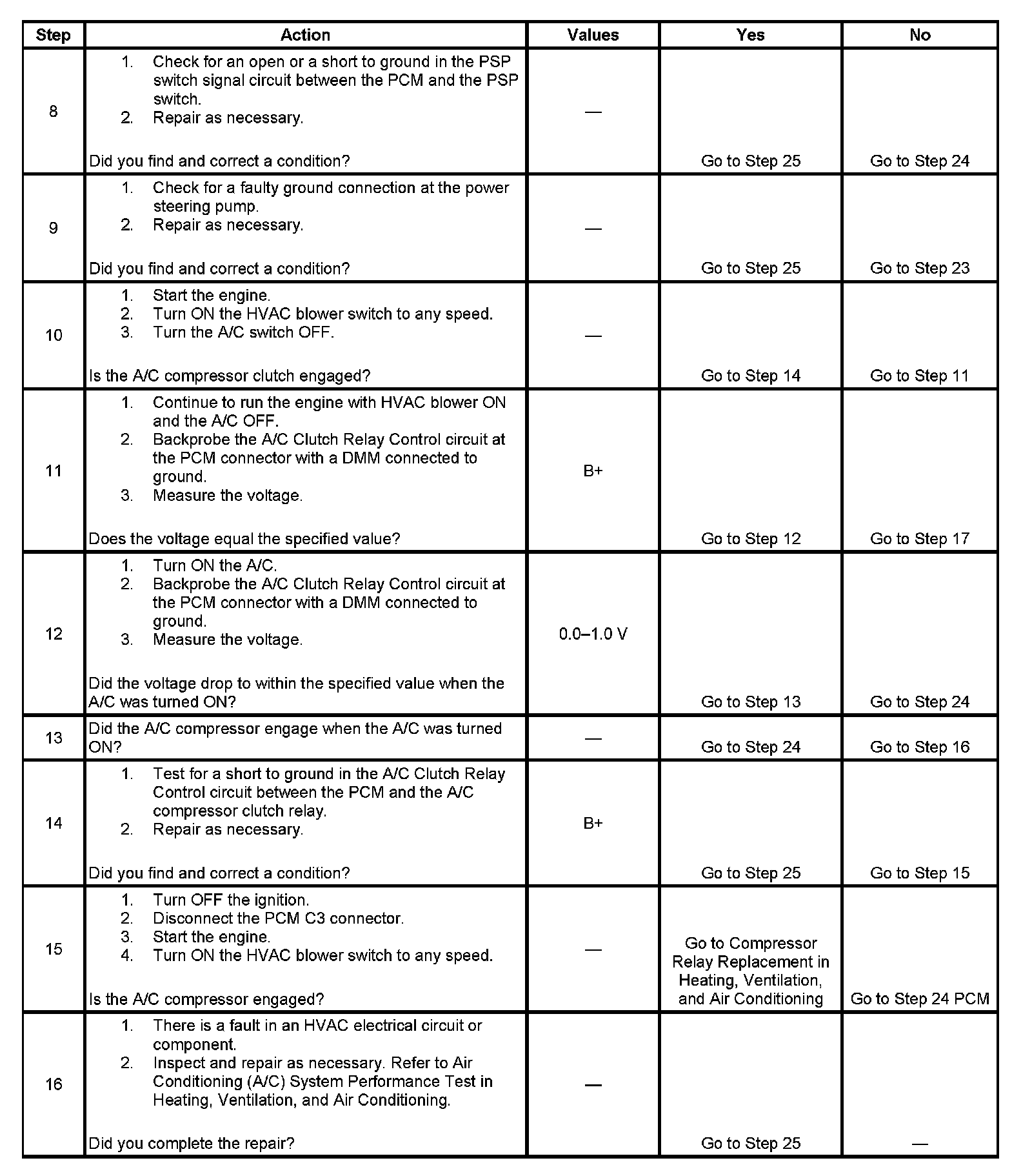13. If the A/C compressor clutch engages, the compressor clutch, the relay, and the control circuit are all OK. The PCM will then need to be replaced because there was no increase in the IAC motor command percentage during A/C operation in Step 4.