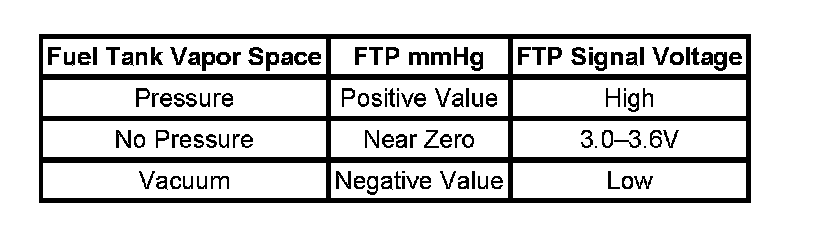 The fuel tank pressure (FTP) sensor, measures the difference between the fuel tank and outside air pressure. The FTP sensor is an integral part of the EVAP vacuum leak pump assembly. The PCM provides a 5-volt reference and a ground to the FTP sensor. The FTP sensor provides a signal voltage back to the PCM that can vary between 0.1 and 4.9 volts. As the fuel tank pressure increases, the FTP sensor voltage decreases, as the fuel tank pressure decreases the FTP sensor voltage increases. High pressure = high voltage. Low pressure vacuum = low voltage.