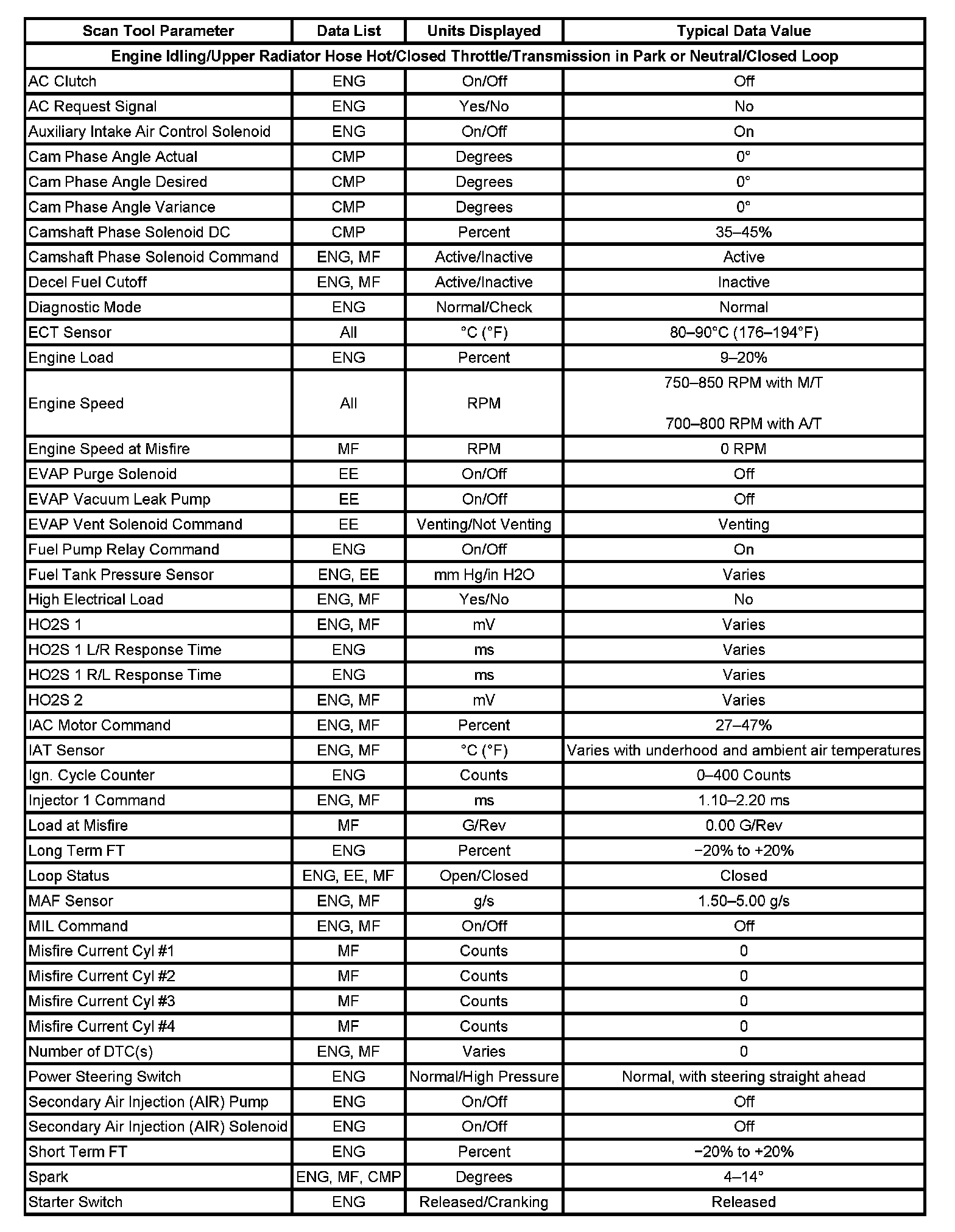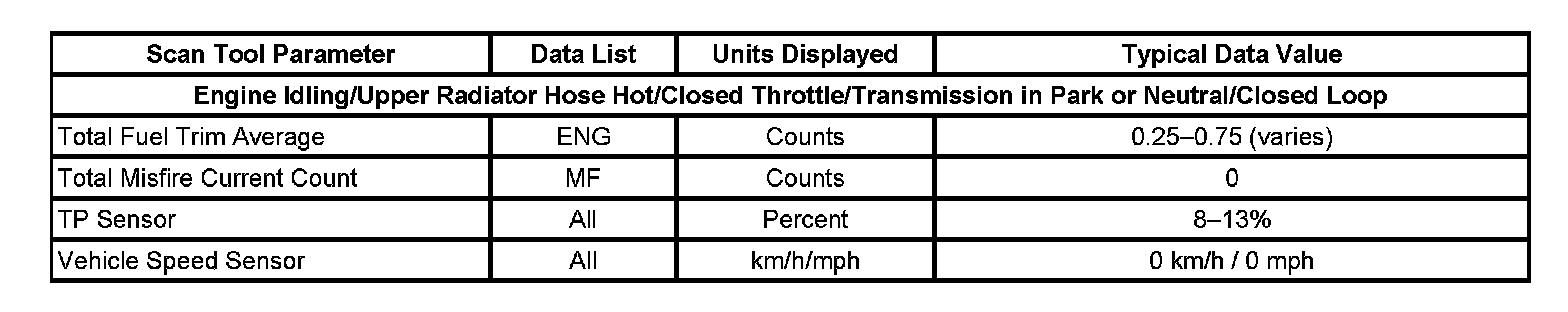 Scan tool values from a properly running engine may be used for comparison with the engine you are diagnosing. The Engine Scan Tool Data List represents values that would be seen on a normally running engine.