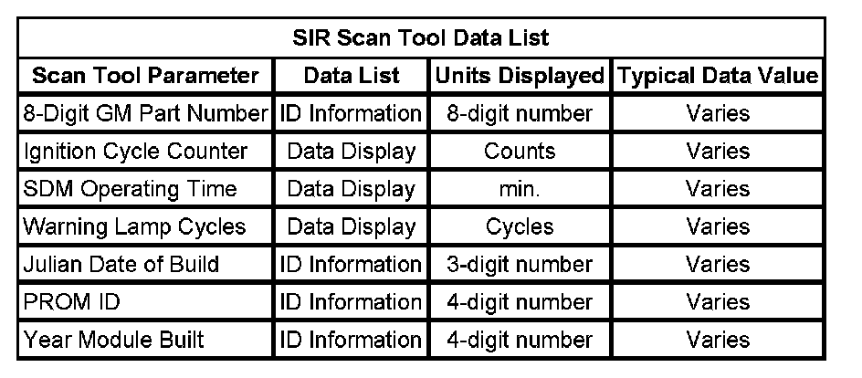 SIR Scan Tool Data List: