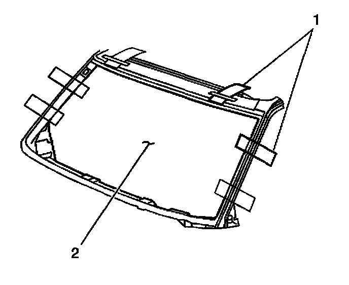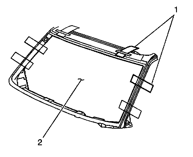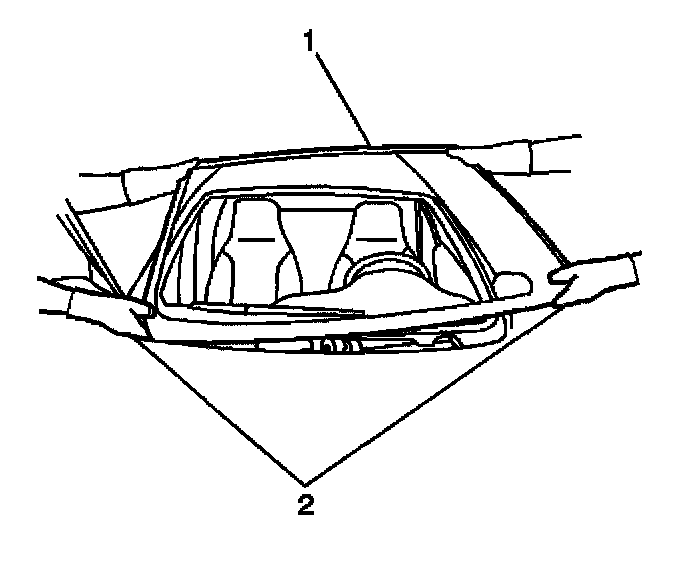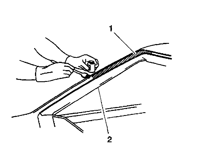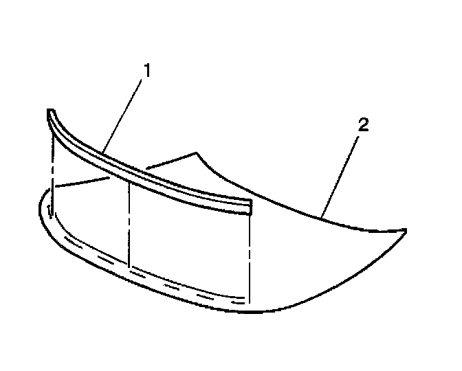 12. Install the new windshield acoustic strip (1) to the windshield (2), if equipped or damaged. The acoustic strip aids in reducing noise.