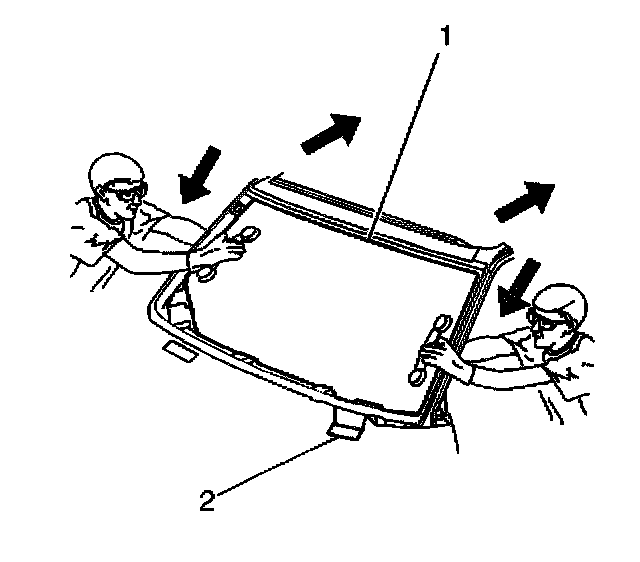 25. With the aid of an assistant, place the window in the opening. If installing a windshield, place the windshield on the lower supports (2), if equipped.