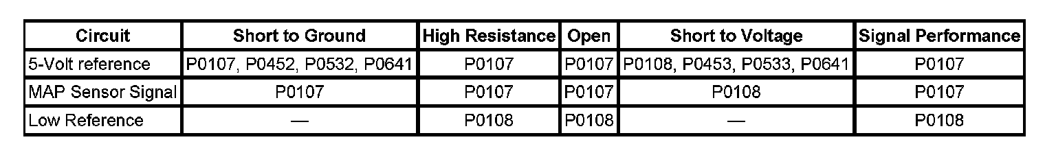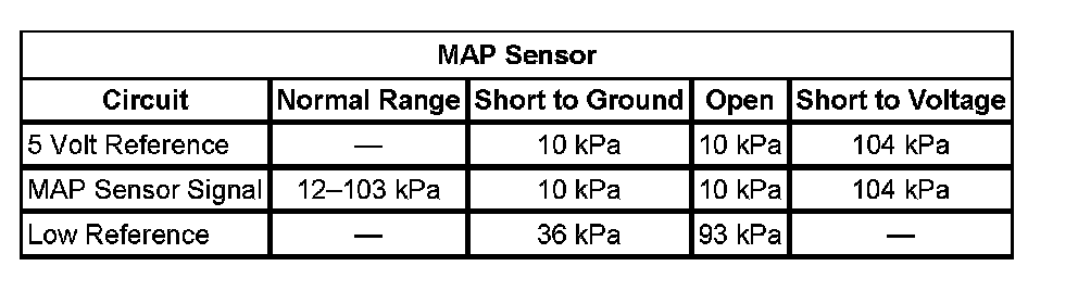 - The control module detects that the MAP sensor voltage is less than 0.1 volt for more than 3 seconds.