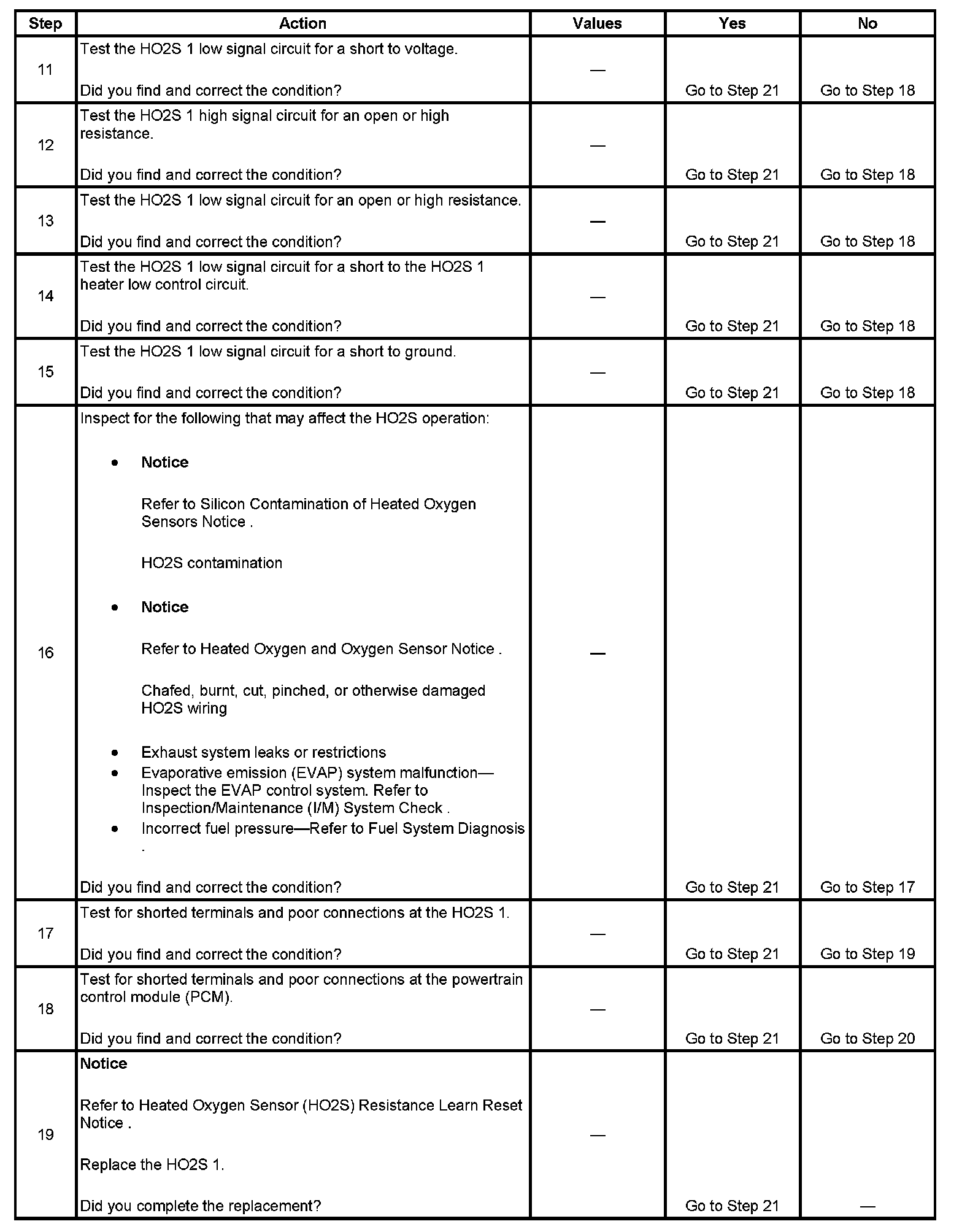 If the PCM detects that the HO2S 1 voltage remains at or near the bias voltage amount, DTC P0154 will set.