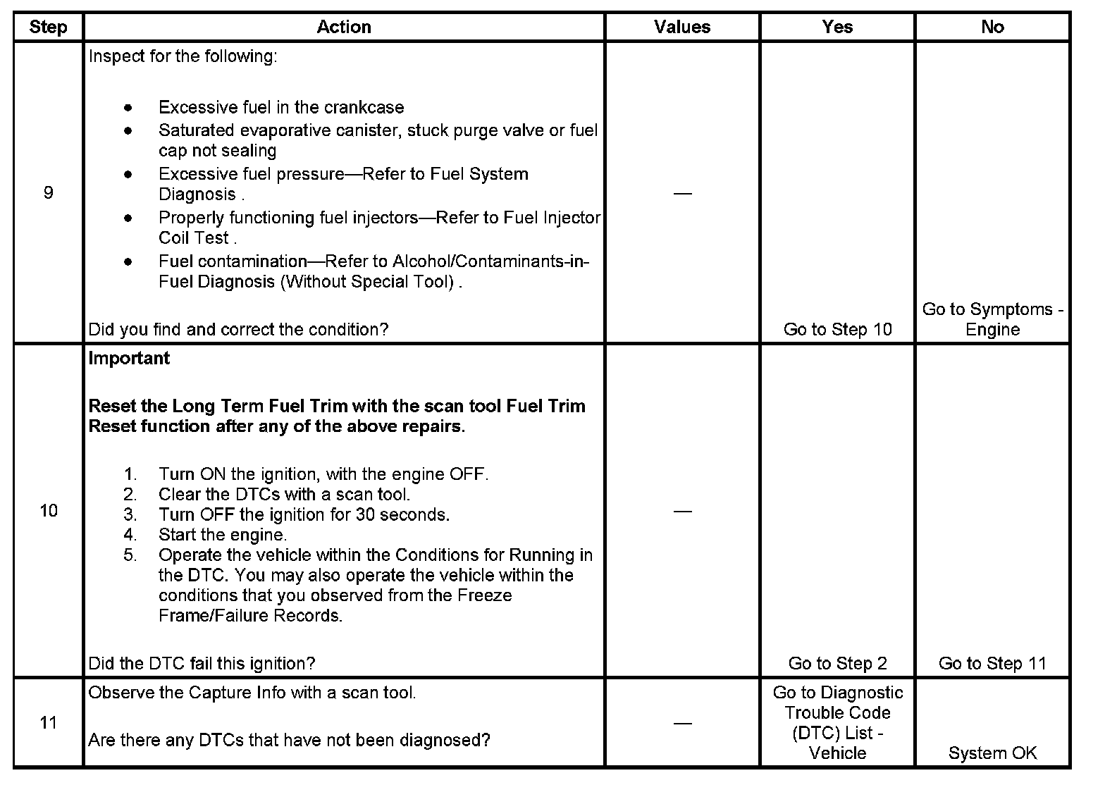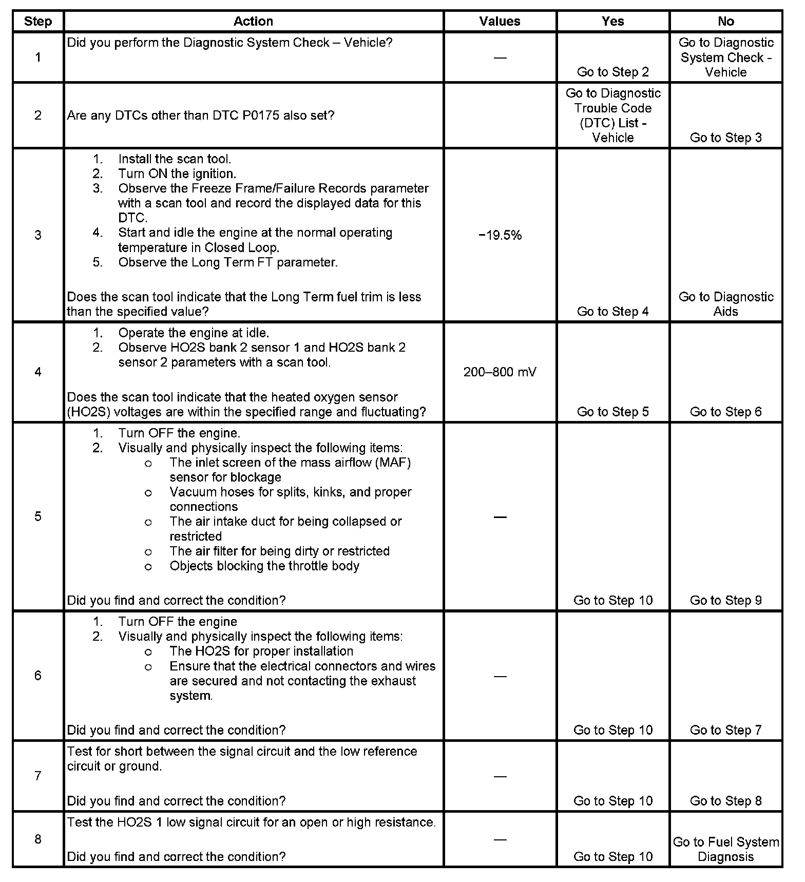 The powertrain control module (PCM) controls the air/fuel metering system in order to provide the best possible combination of driveability, fuel economy and emission control. Fuel delivery is controlled differently during Open and Closed Loop. During Open Loop the PCM determines fuel delivery based on sensor signals, without oxygen sensor input. During Closed Loop the PCM adds oxygen sensor inputs and level of purge to calculate Short and Long Term fuel trim adjustments. If the oxygen sensors indicate a lean condition, fuel trim values will be above 0 percent. If the oxygen sensors indicate a rich condition, fuel trim values will be below 0 percent. The values for the Short Term fuel trim change rapidly in response to the heated oxygen sensor (HO2S) voltage signals. Long Term fuel trim makes coarse adjustments in order to maintain an Air/Fuel Ratio of 14.7:1. A block of cells contain information arranged in combinations of engine RPM and engine load for a full range of vehicle operating conditions. The long term fuel trim diagnostic is based on an average of cells currently being used. The PCM selects the cells based on the engine speed and engine load. The fuel trim diagnostic will conduct a test to determine if a rich failure actually exists or if excessive vapor from the evaporative emission (EVAP) canister is causing a rich condition. If the PCM detects an excessively rich condition, DTC P0175 sets.