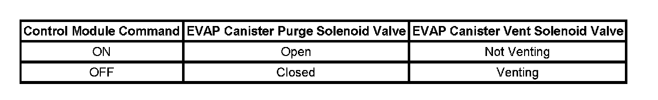 The table illustrates the relationship between the ON and OFF states, and the Venting or Not Venting states of the EVAP canister purge and vent solenoid valves.