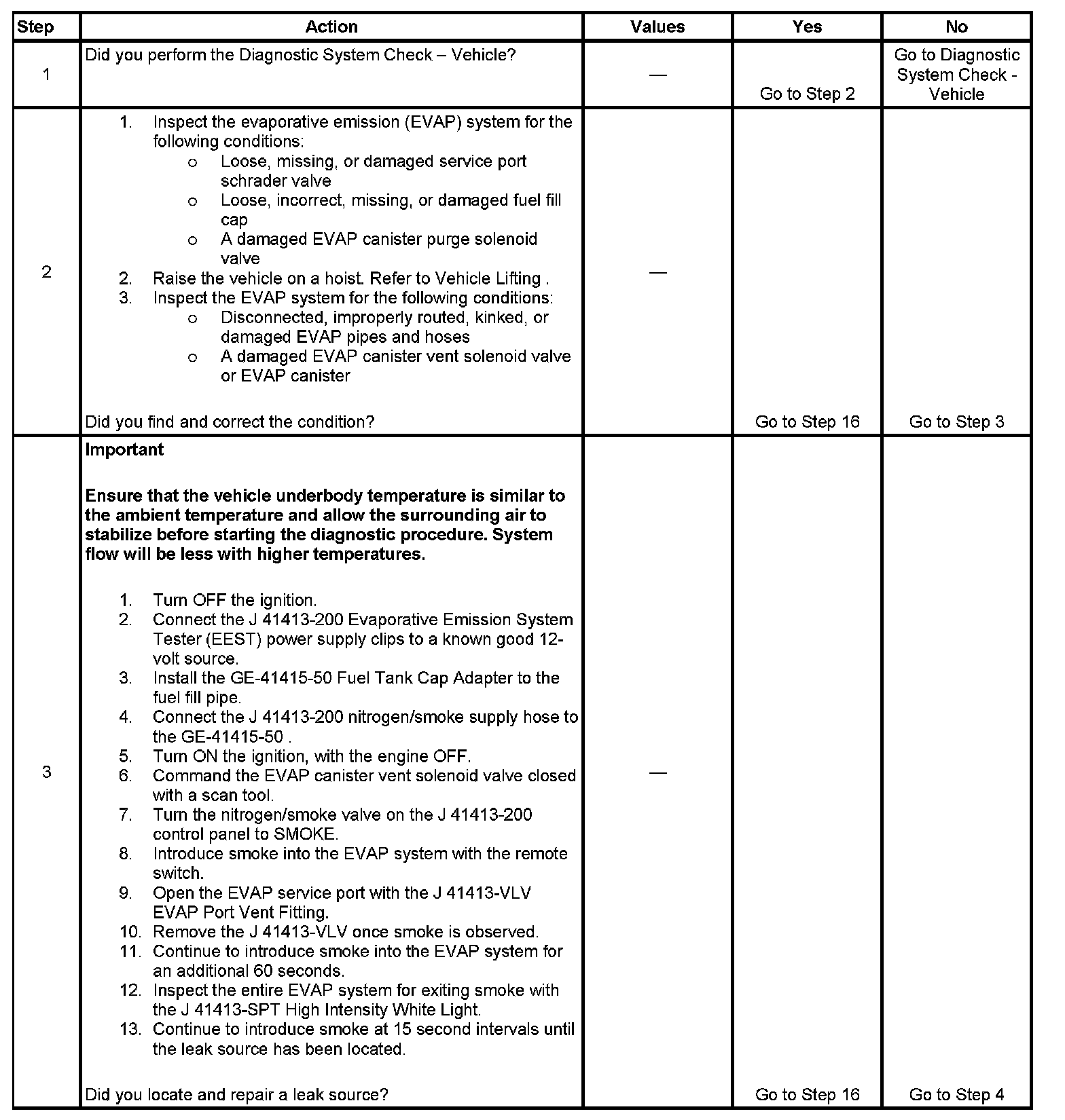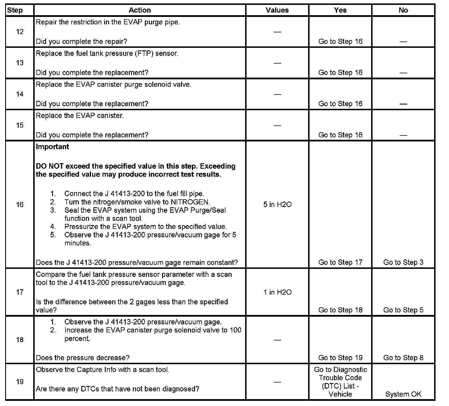 The control module tests the evaporative emission (EVAP) system for a large leak. The control module monitors the fuel tank pressure (FTP) sensor signal to determine the EVAP system vacuum level. When the conditions for running are met, the control module commands the EVAP canister purge solenoid valve OPEN and the EVAP canister vent solenoid valve CLOSED. This allows engine vacuum to enter the EVAP system. At a calibrated time, or vacuum level, the control module commands the EVAP canister purge solenoid valve closed, sealing the system, and monitors the FTP sensor input in order to determine the EVAP system vacuum level. If the system is unable to achieve the calibrated vacuum level, or if the vacuum level decreases too rapidly, this DTC sets.