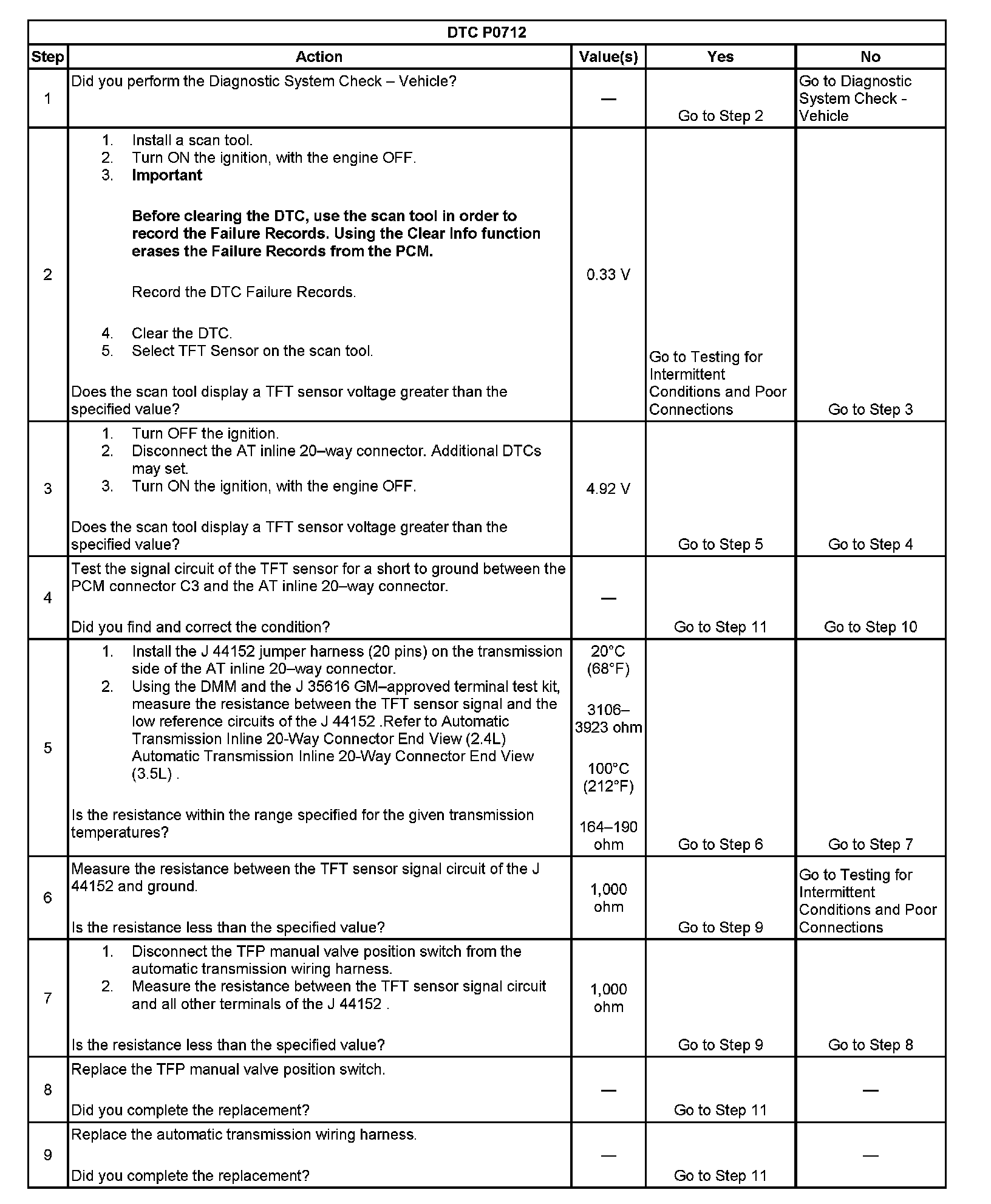When the PCM detects a continuous short to ground in the TFT circuit or the TFT sensor, then DTC P0712 sets. DTC P0712 is a type C DTC.