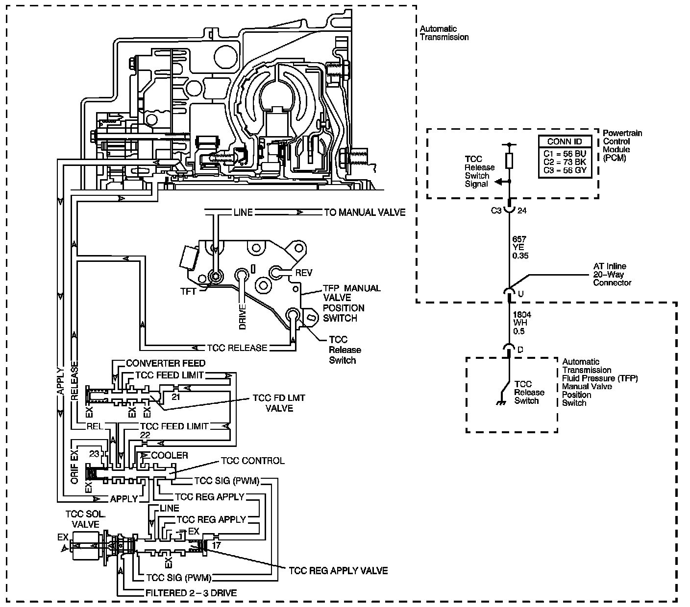 The TCC release switch is part of the automatic transmission fluid pressure (TFP) manual valve position switch. The TFP manual valve position switch is attached to the control valve body.