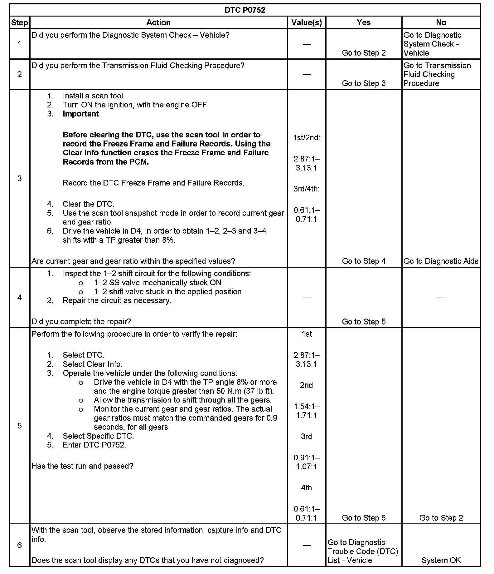 The powertrain control module (PCM) monitors the actual gear ratio, and compares the actual gear ratio with the commanded gear ratio. DTC P0752 sets under two conditions: