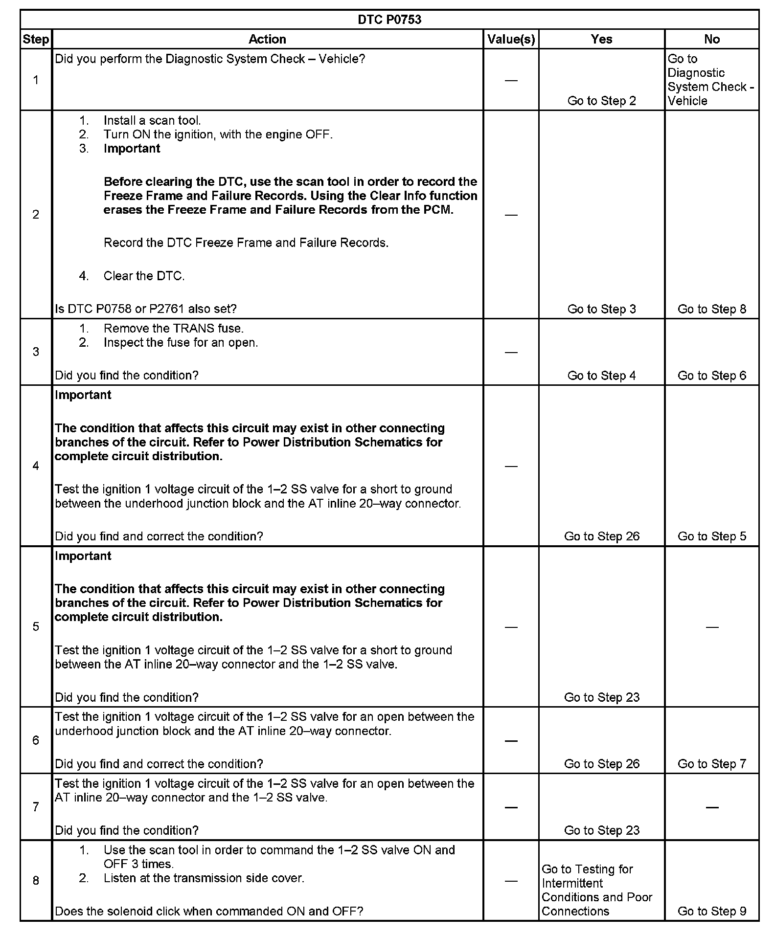 When the PCM detects a continuous open, short to ground, or short to voltage in the 1-2 SS valve circuit, then DTC P0753 sets. DTC P0753 is a type A DTC.